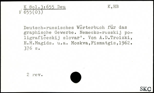 Deutsch-russisches Wörterbuch für das graphische Gewerbe. Nemecko-russkij po-ligraficeskij slovar’. Von A.D.Troizki, E.M.Magids. u.a. Moskva,Fismatgis,1$62.