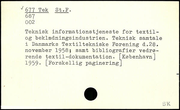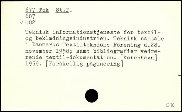 Teknisk informationstjeneste for textil-og beklædningsindustrien,. Teknisk samtale i Danmarks Textiltekniske Forening d,28. november 1958, samt bibliografier vedrørende textil-dokumentation