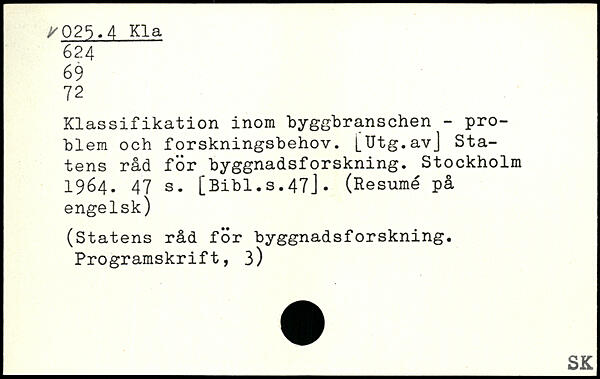 Klassifikation inom byggbranschen - problem och forskningsbehov. [Utg.avJ Statens råd för byggnadsforskning.