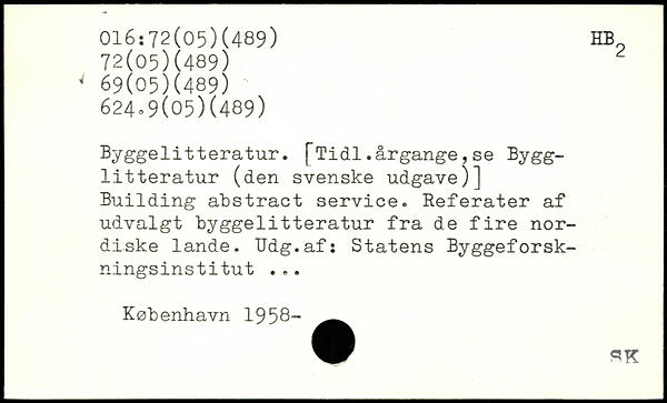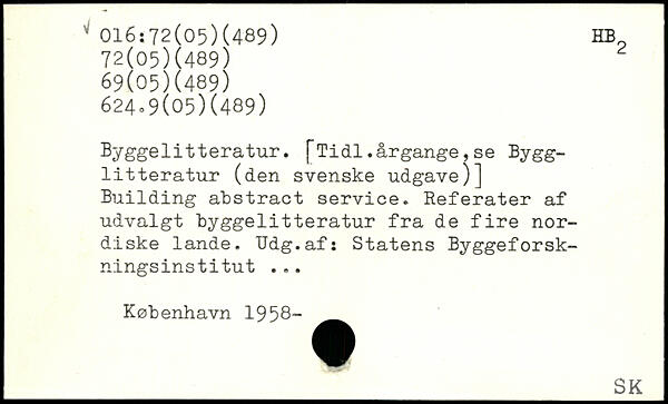 Byggelitteratur. fTidl.årgange,se Bygg-litteratur (den svenske udgave)] Building abstract service. Referater af udvalgt byggelitteratur fra de fire nordiske lande. TJdg.af: Statens Byggeforskningsinstitut. ..