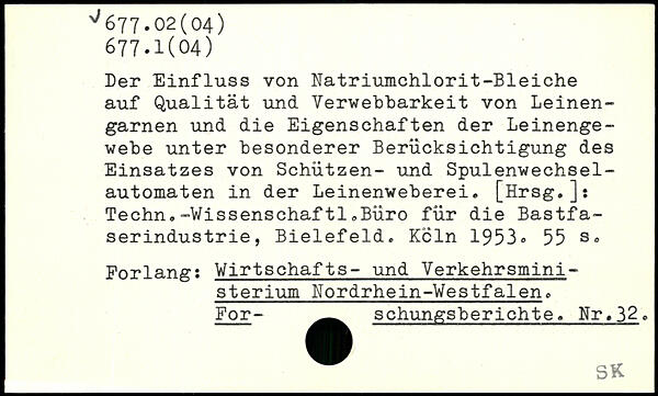 Der Einfluss von Natriumchlorit-Bleiche auf Qualität und Verwebbarkeit von Leinengarnen und die Eigenschaften der Leinengewebe unter besonderer Berücksichtigung des Einsatzes von Schützen- und Spulenwechselautomaten in der Leinenweberei. [Hrsg.]: Techn.-Wissenschaftl.Büro für die Bastfaserindustrie, Bielefeld.