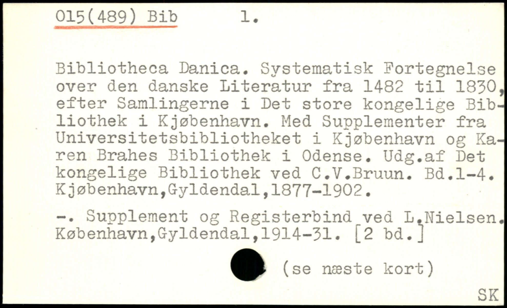 Bibliotheca Danica. Systematisk Fortegnelse over den danske Literatur fra 1482 til 1830, efter Samlingerne i Det store kongelige Bibliothek i Kjøbenhavn. Med Supplementer fra Universitetsbibliotheket i Kjøbenhavn og Karen Brahes Bibliothek i Odense. Udg.af Det kongelige Bibliothek ved C.V.Bruun.