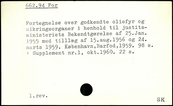 Fortegnelse over godkendte oliefyr og sikringsorganer i henhold til justitsministeriets Bekendtgørelse af 25.Jan. 1955 med t1111æg af 15.aug.1956 og 24. marts 1959-