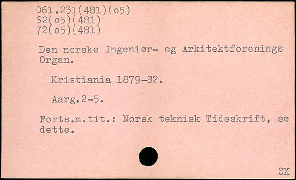 Den norske Ingeniør- og Arkitektforenings Organ. Kristiania 1879-82. Aarg.2-5. Ports.m.tit.: Korsk teknisk Tidsskrift, se dette. c y