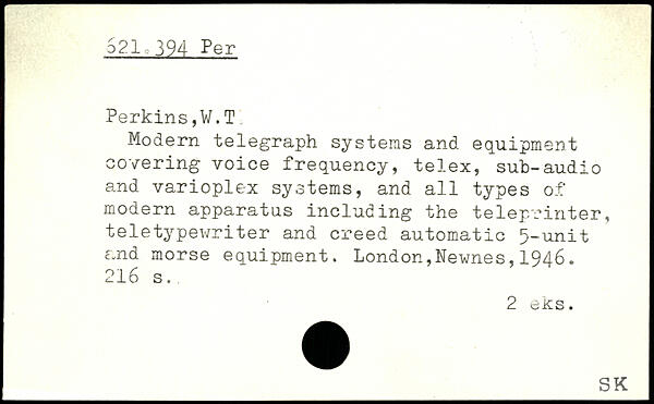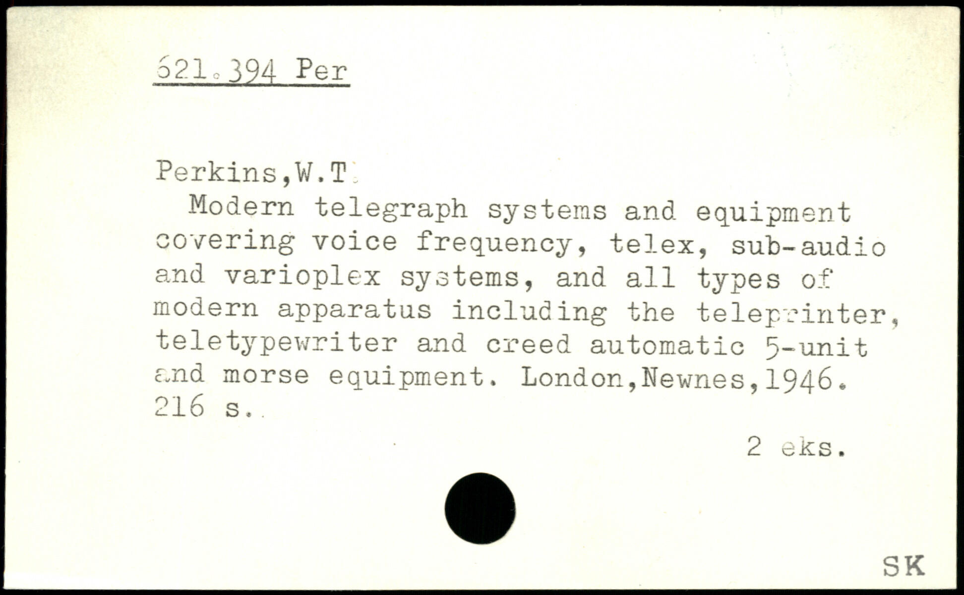 Modern telegraph systems and equipment covering voice frequency, telex, sub-audio and varioplex systems, and all types of modern apparatus including the teleprinter, teletypewriter and creed automatic 5-unit and morse equipment.