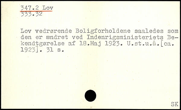 Lov vedrørende Boligforholdene saaledes som den er ændret ved Indenrigsministeriets Bekendtgørelse af 18.Maj 1923. U.st.u.å.[ca. 1923].