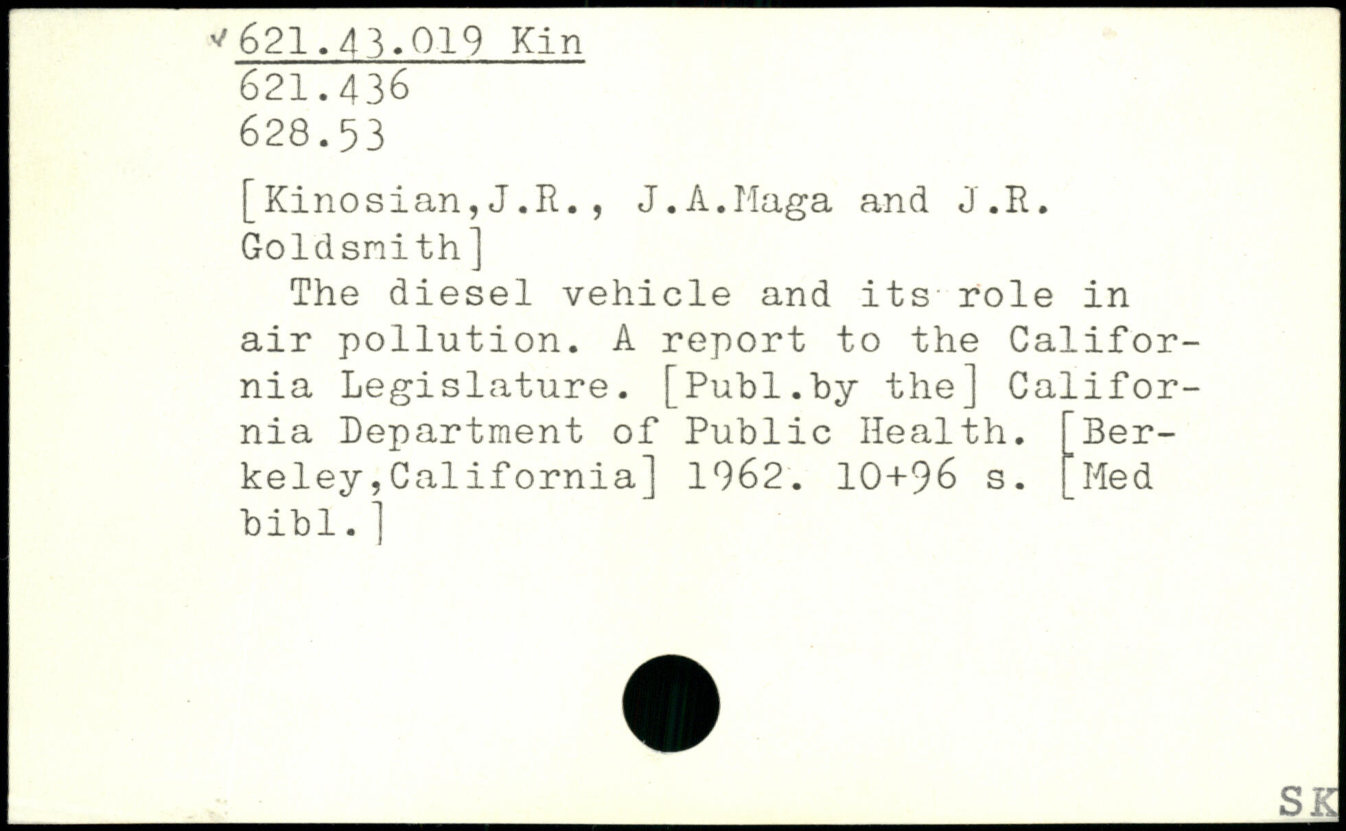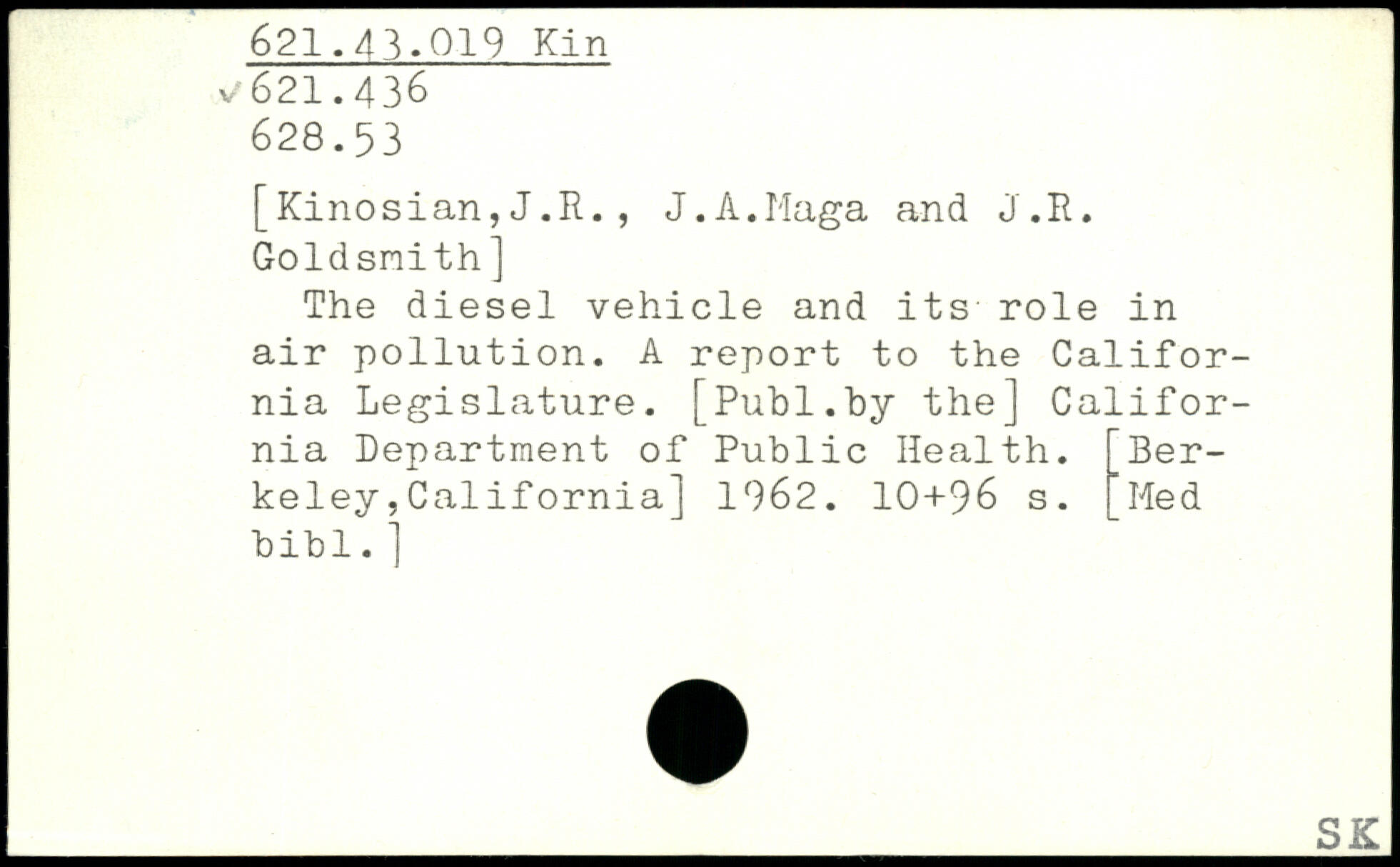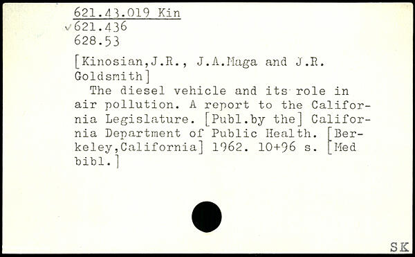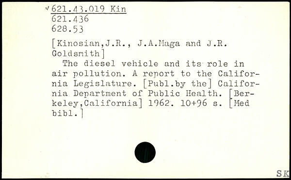 [Kinosian,J.R., J.A.Maga and J.R. Goldsmith] The diesel vehicle and its role in air pollution. A report to the California Legislature.