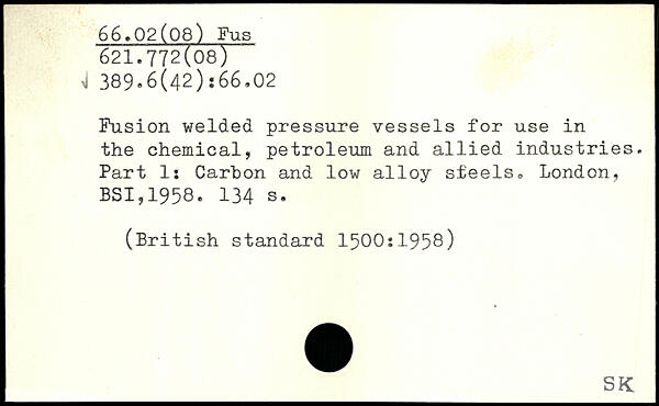Fusion welded pressure vessels for use in the chemical, petroleum and allied industries. Part 1: Carbon and low alloy steels.
