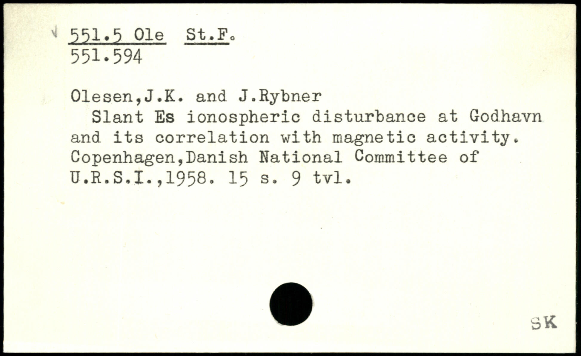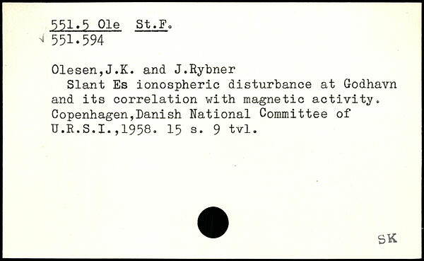 01esen,J.K. and J.Rybner Slant Es ionospheric disturbance at Godhavn and its correlation with magnetic activity. Copenhagen,banish National Committee of U.R.S.I.,1958.