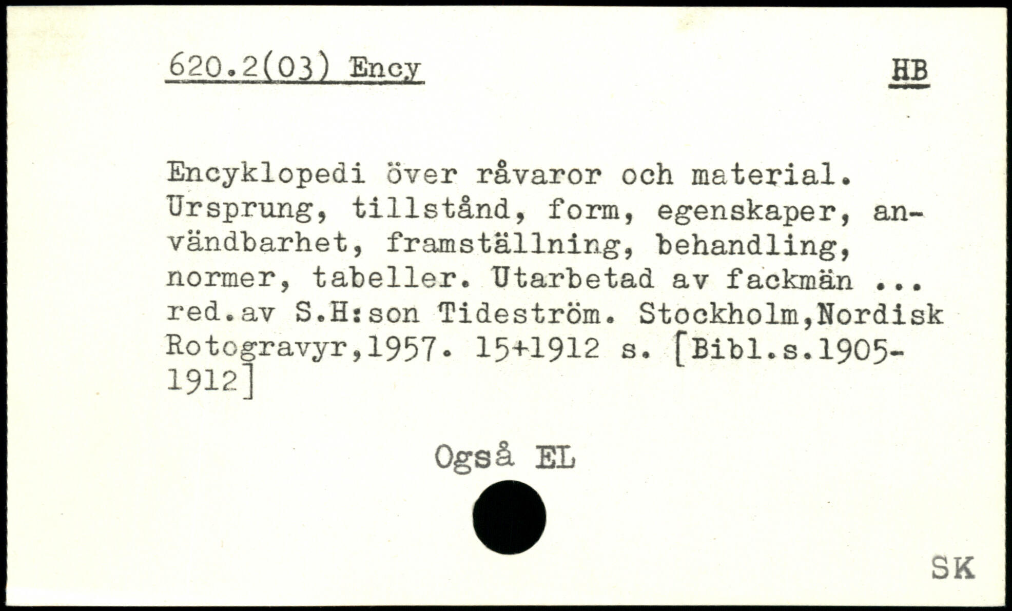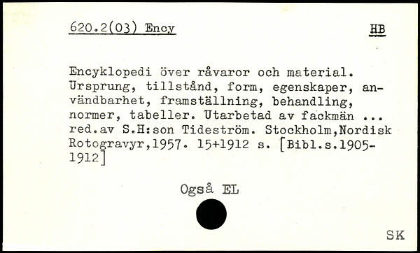 Encyklopedi över råvaror och material. Ursprung, tillstånd, form, egenskaper, användbarhet, framställning, behandling, normer, tabeller. Utarbetad av fackmän ... red.av S.Hsson Tideström.