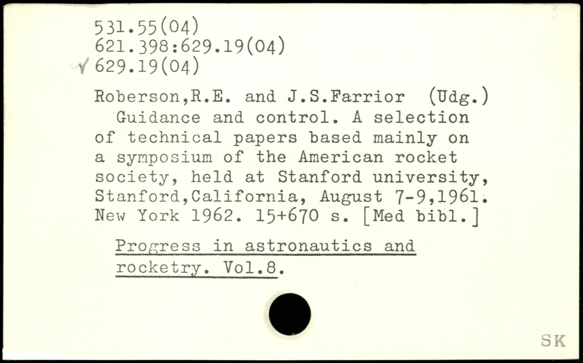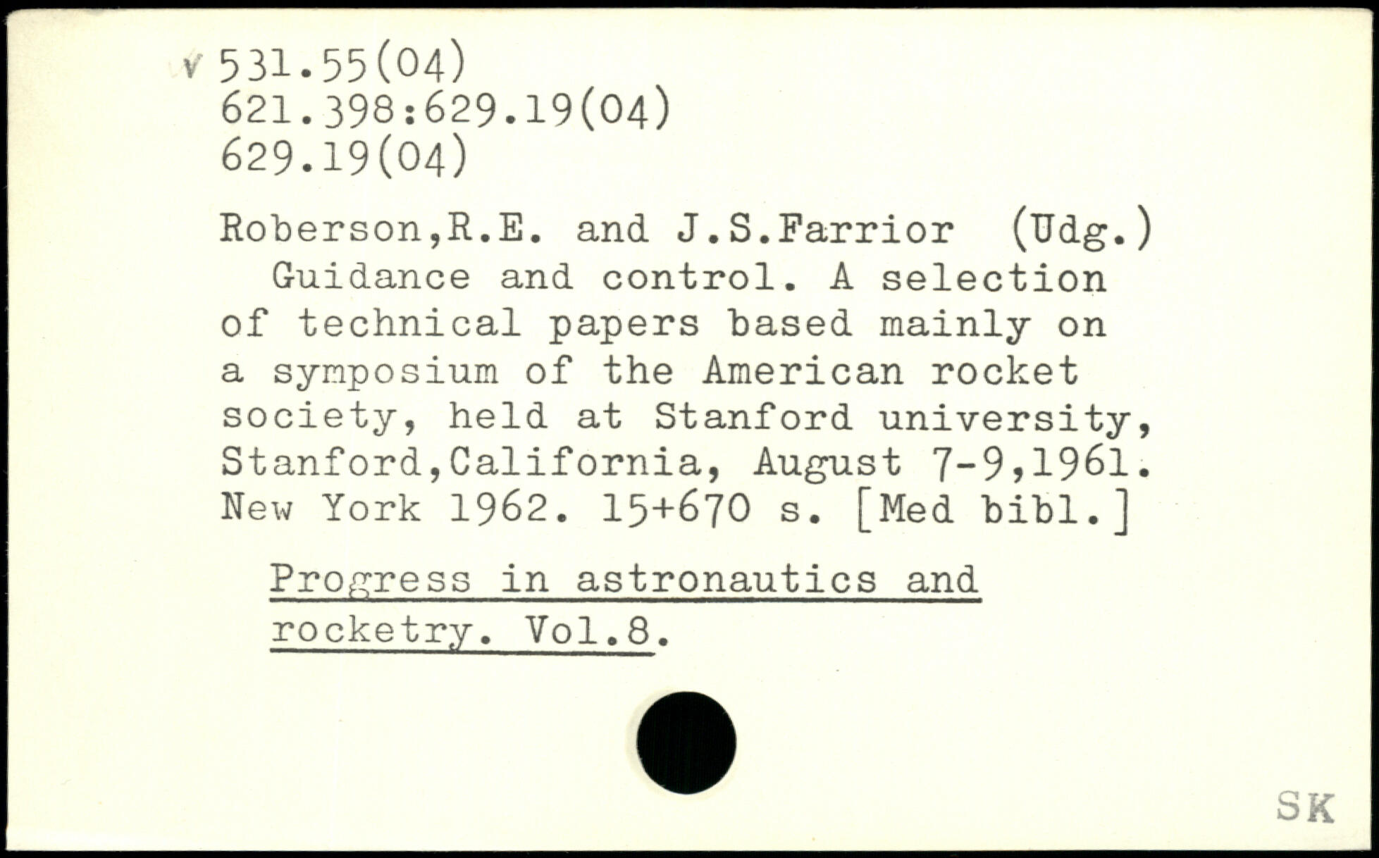 Guidance and control. A selection of technical papers based mainly on a symposium of the American rocket society, held at Stanford university, Stanford,California, August 7-9,1961.