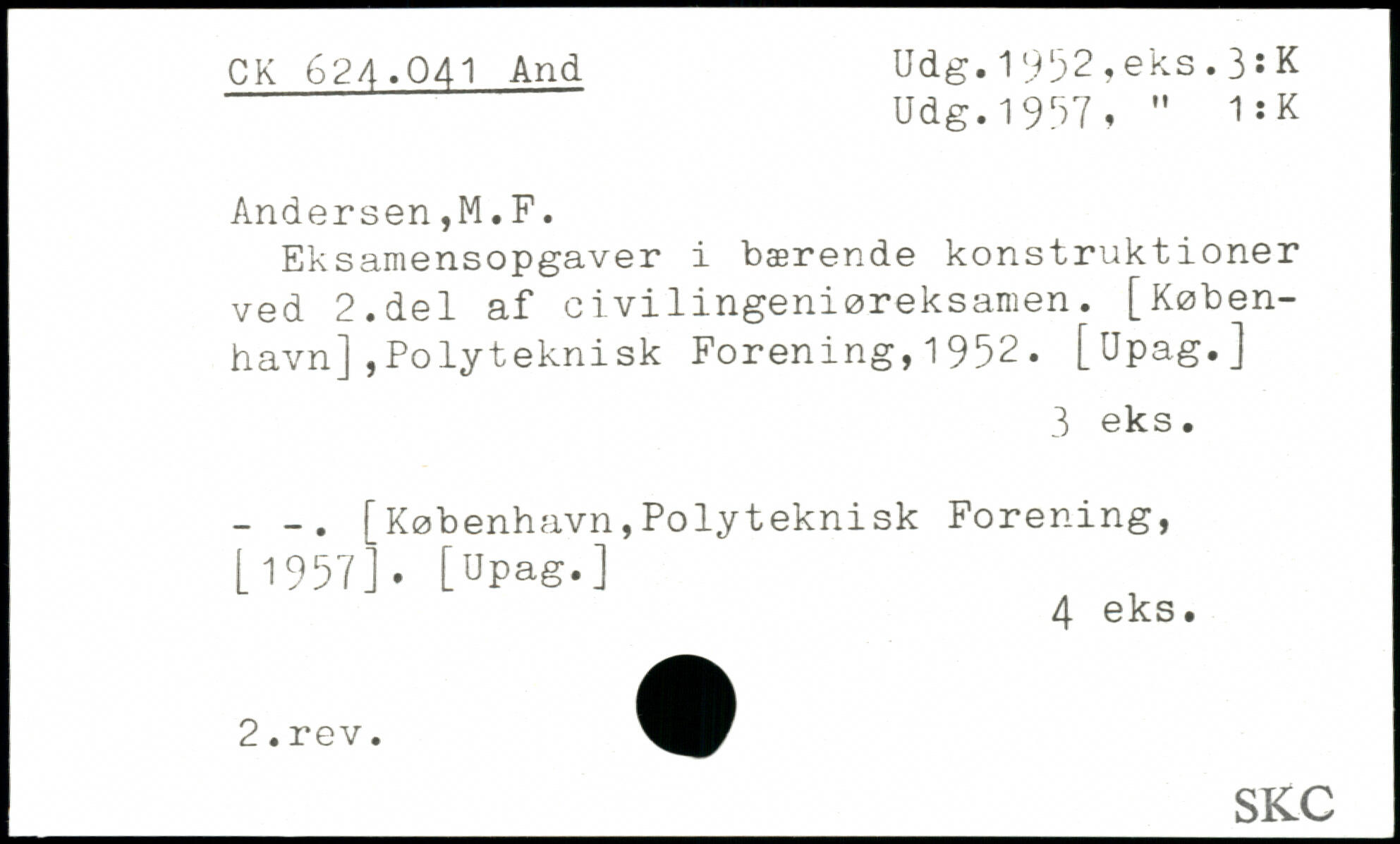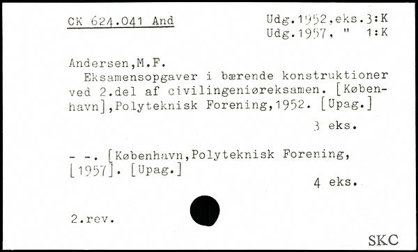 Eksamensopgaver i bærende konstruktioner ved 2.del af civilingeniøreksamen. [København] ,Polyteknisk Forening,1952. [Upag.]