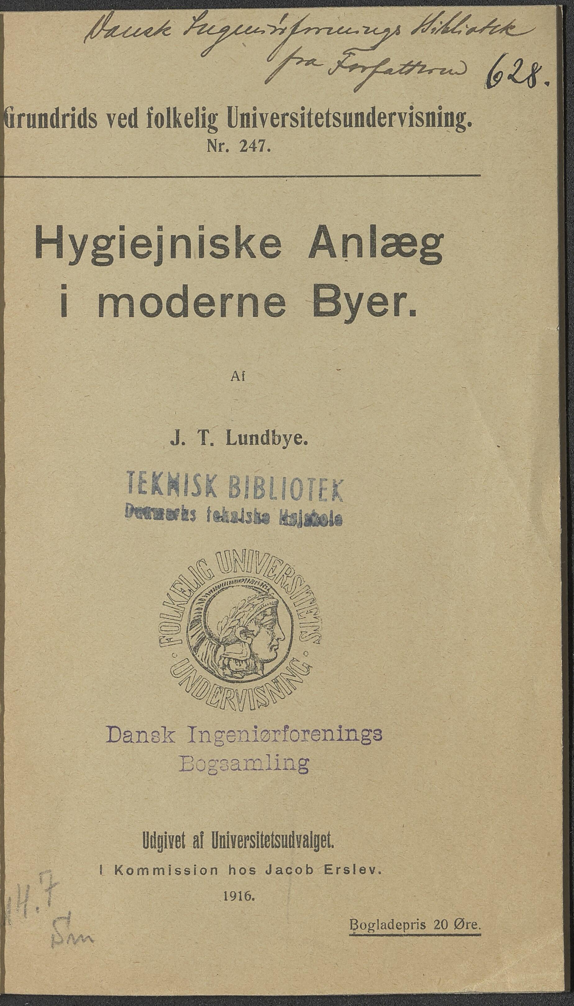 Grundrids ved folkelig Universitetsundervisning. Nr. 247. Hygiejniske Anlæg i moderne Byer. Af J. T. Lundbye. TEKNISK BIBLIOTEK Dansk Ingeniørforenings Bogsamling Udgivet af üniversitetsudvalget I Kommission hos Jacob Erslev. 1916. 'I ' Bogladepris 20 Øre.