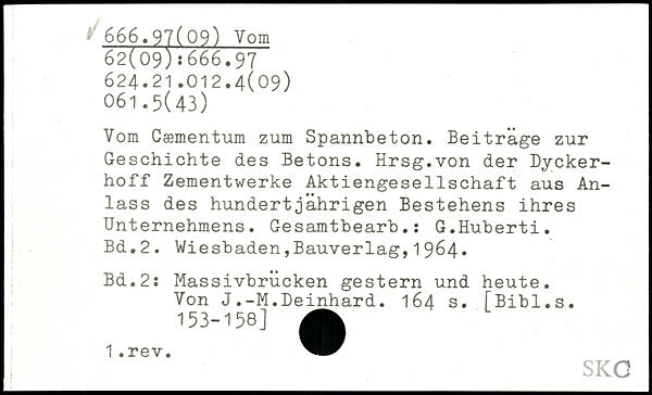 Vom Coementum zum Spannbeton. Beitrage zur Geschichte des Betons. Hrsg.von der Dyckerhoff Zementwerke Aktiengesellschaft aus Anlass des hundert jährigen Bestehens ihres Unternehmens. Gesamtbearb.: G.Huberti.