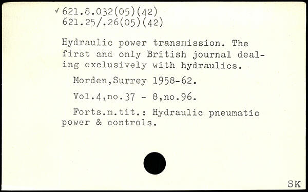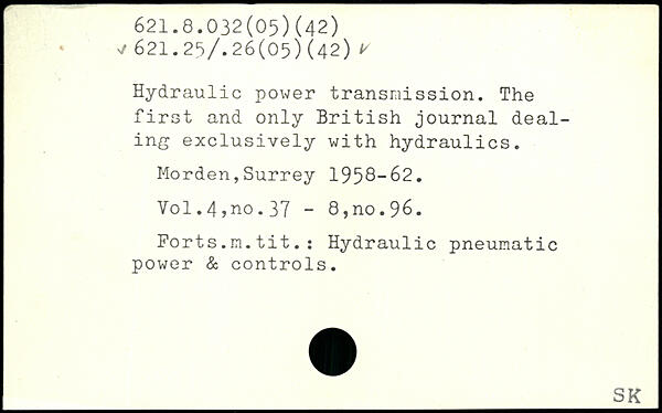 Hydraulic power transmission. The first and only British journal dealing exclusively with hydraulics. Morden,Surrey 1958-62.
