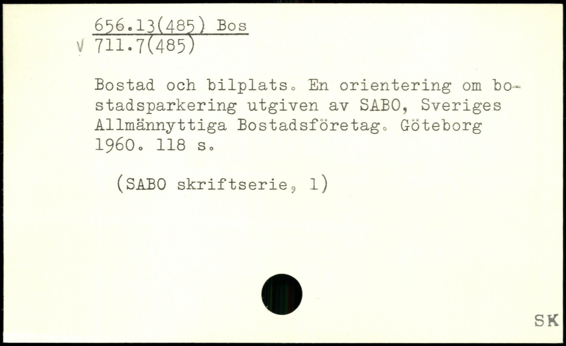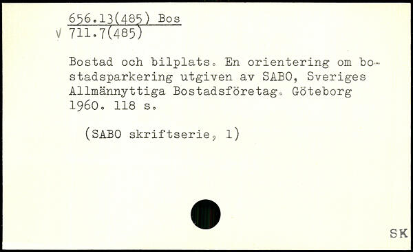 Bostad och bilplats, En orientering om bo-stadsparkering utgiven av SABO, Sveriges Allmännyttiga Bostadsföretag. Göteborg 1960o