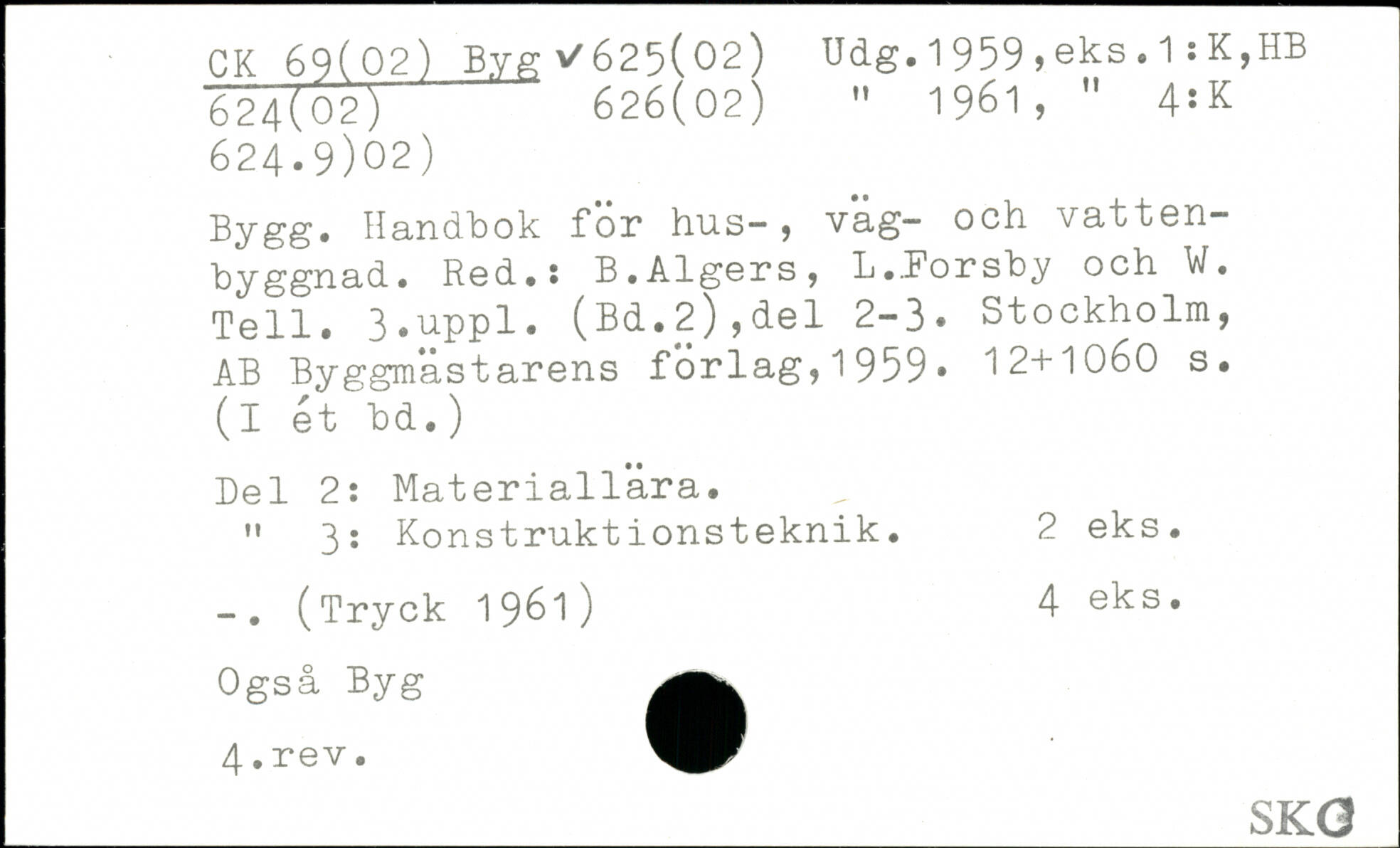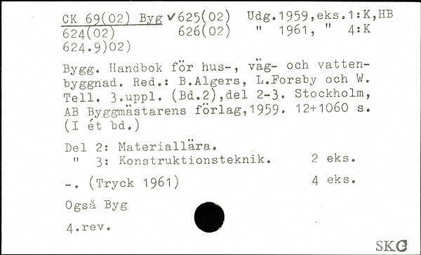 1961, " 4:K 624.9)02) Bygg. Handbok för hus-, väg- och vatten-byggnad. Red. t B.Algers, L..Forsby och W. Tell.