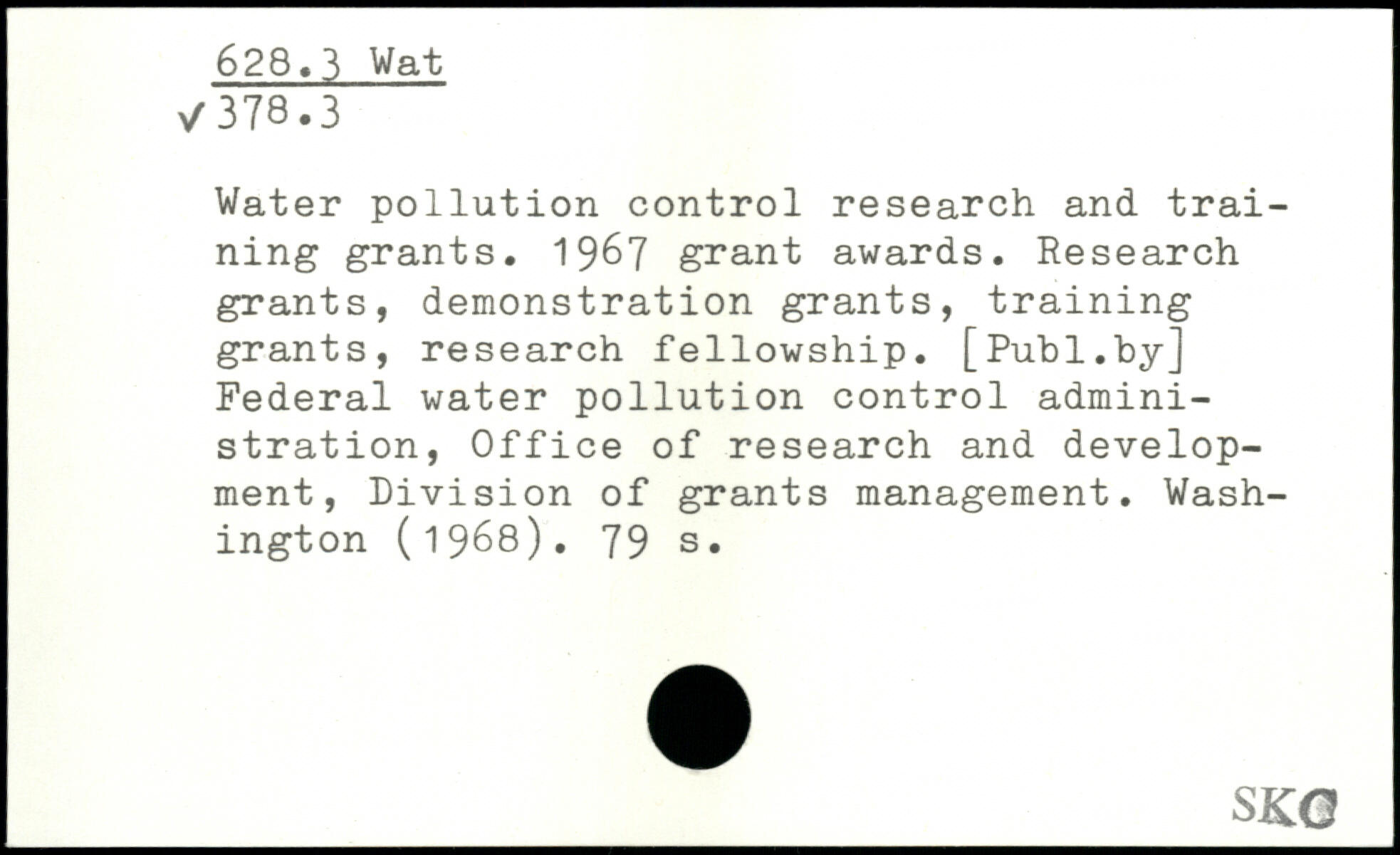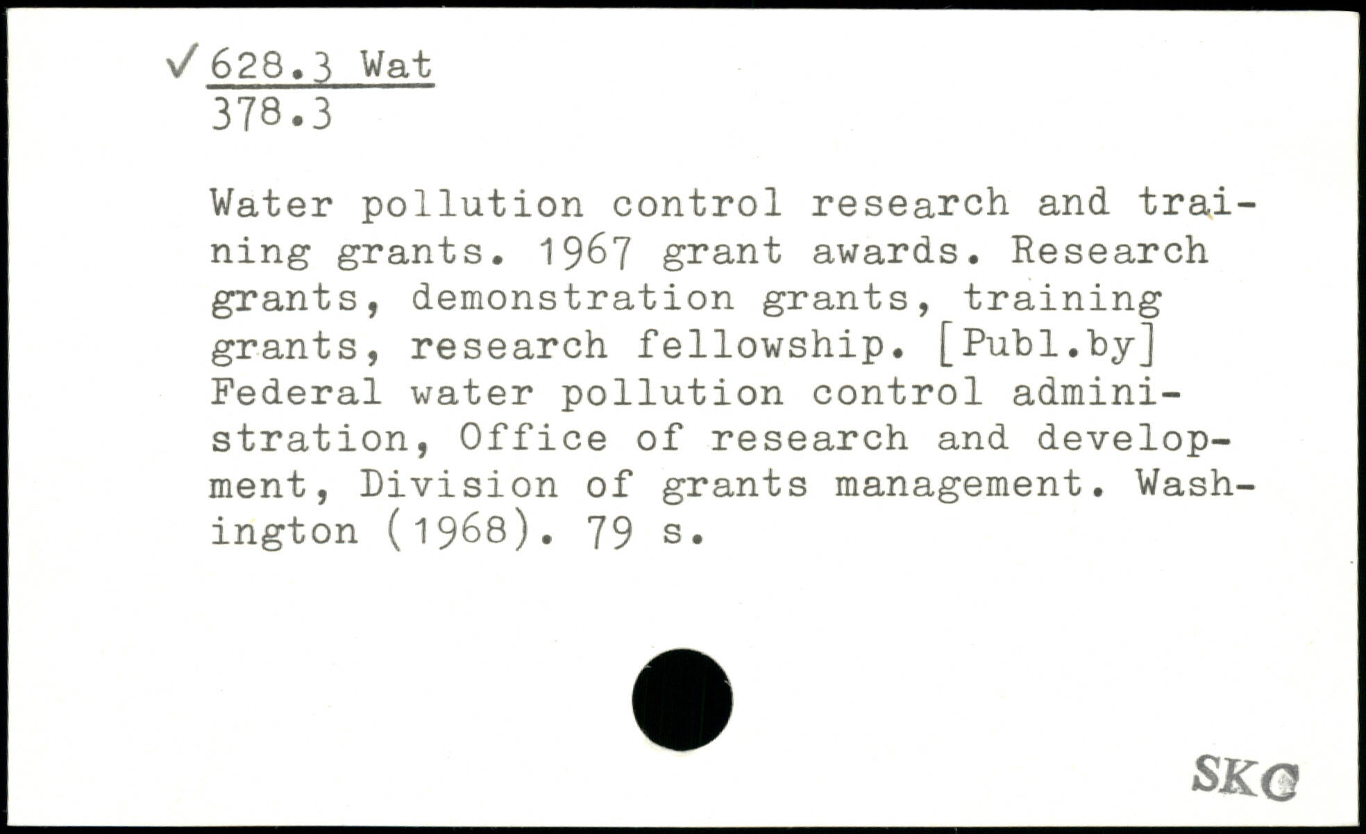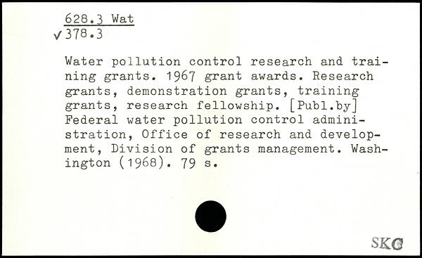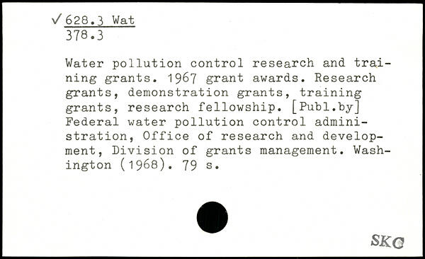 Water pollution control research and training grants. 1967 grant awards. Research grants, demonstration grants, training grants, research fellowship.