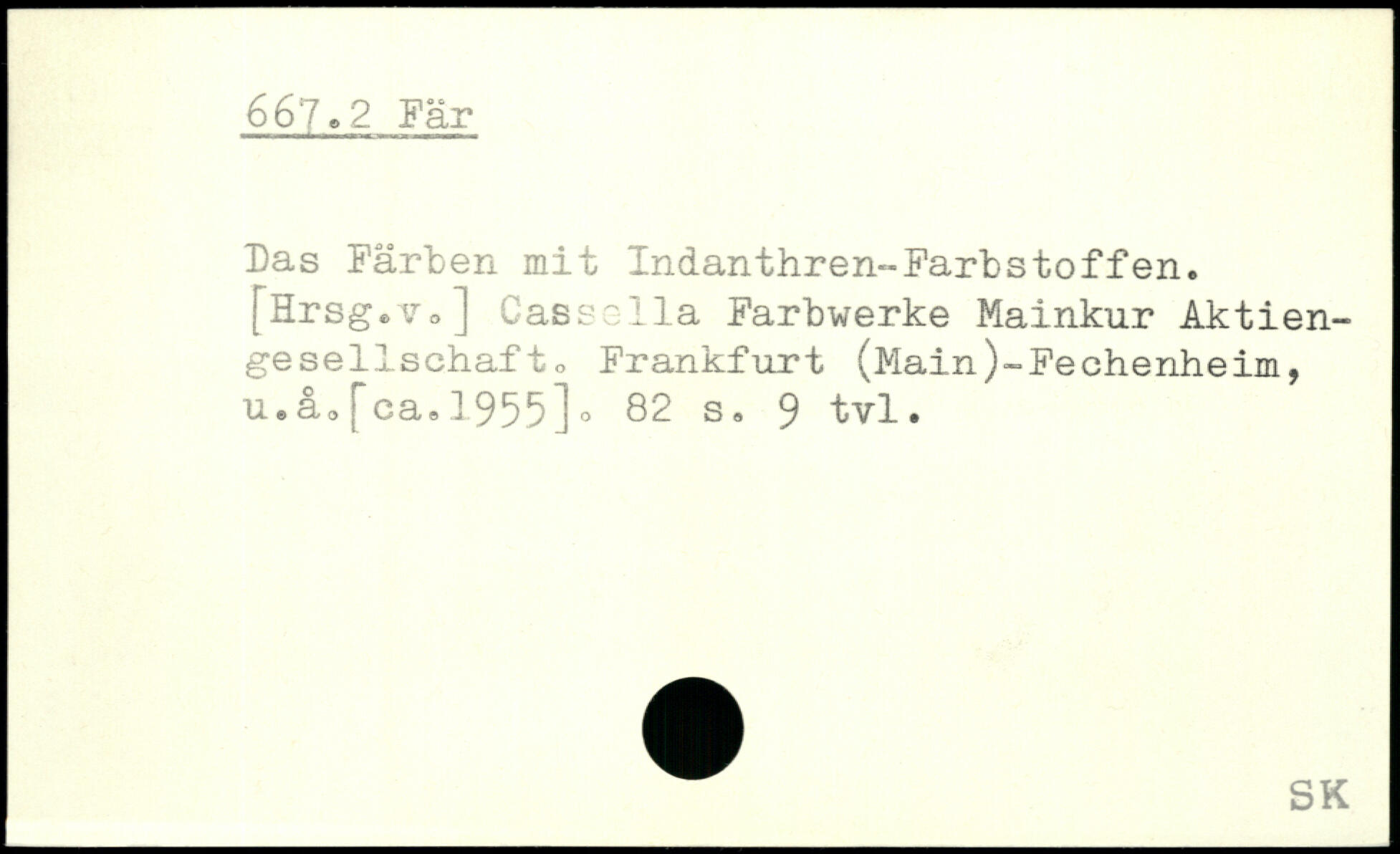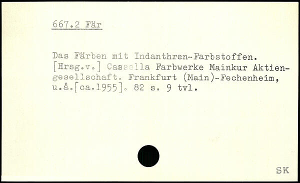 Das Färben mit Indanthren-Farbstoffen. [Hrsg.Vo] Cassslla Farbwerke Mainkur Aktiengesellschaft., Frankfurt (Main)-Fechenheim, u.ä0[ca.1955]o