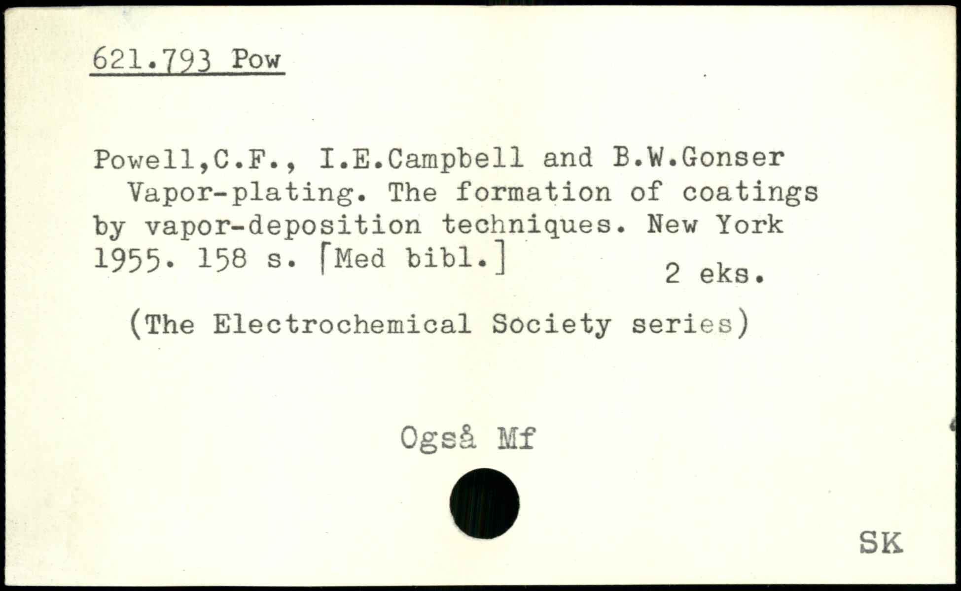 Powell,C.F., I.E.Campbell and B.V.Gonser Vapor-plating. The formation of coatings by vapor-deposition techniques.