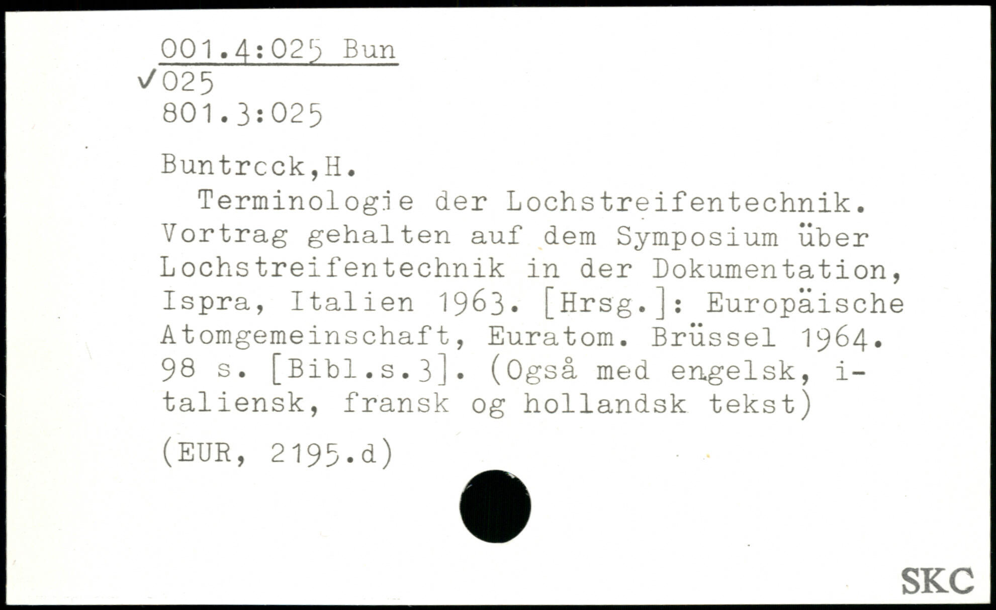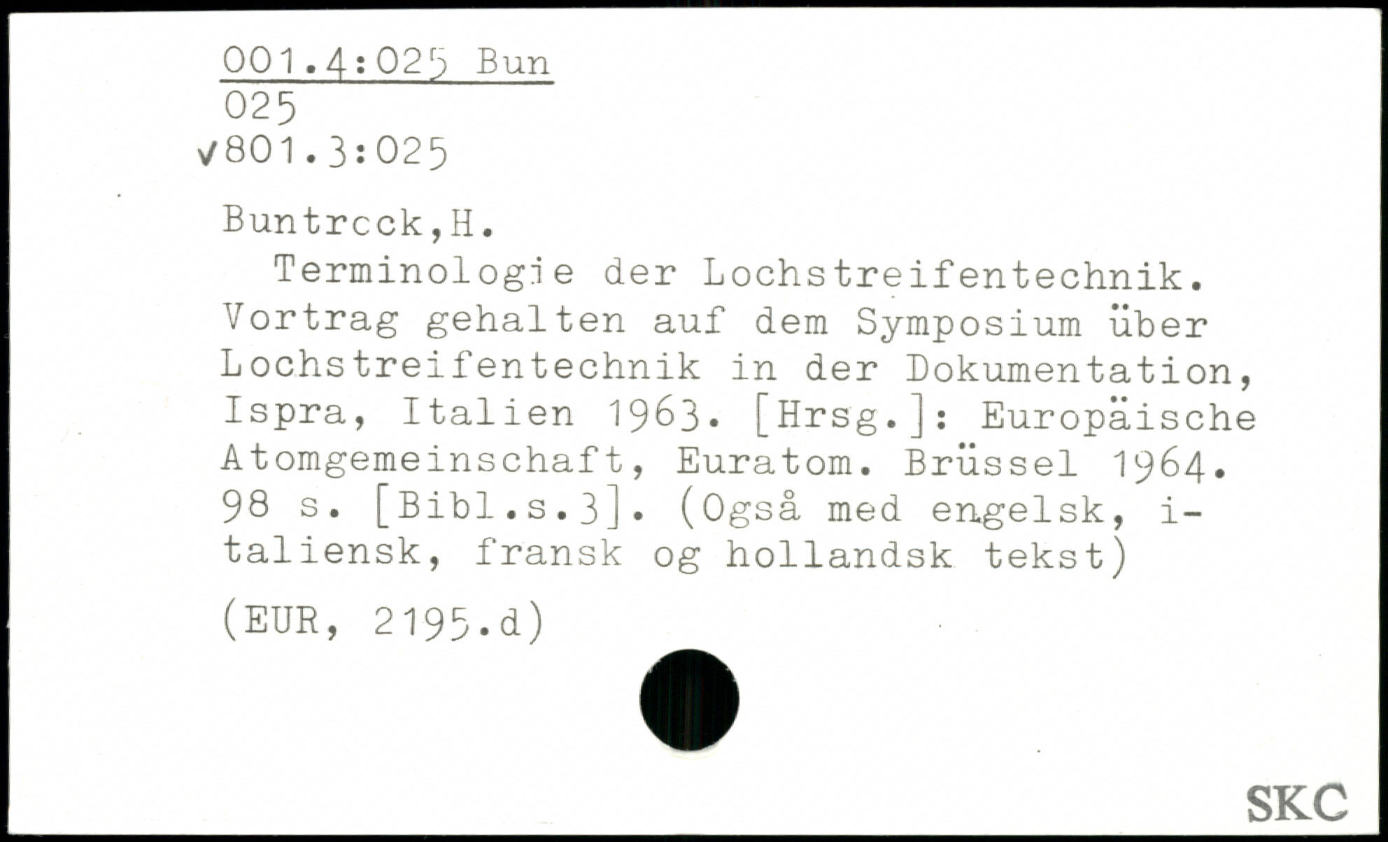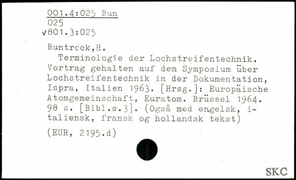 Terminologie der Lochstreifentechnik. Vortrag gehalten auf dem Symposium über Lochstreifentechnik in der Dokumentation, Ispra, Italien 1963.