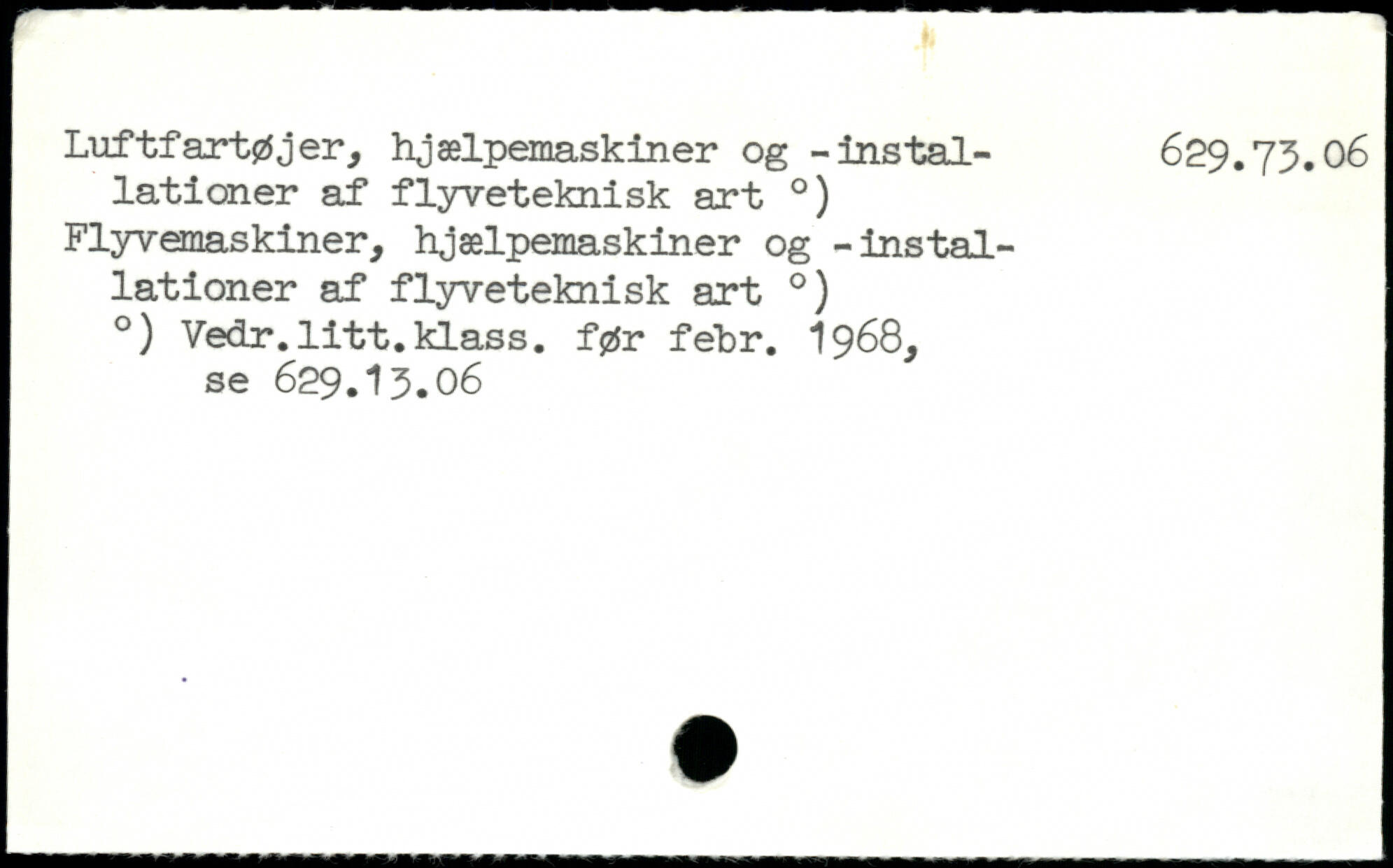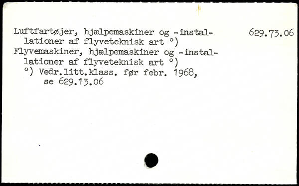 Luftfartøjer, hjælpemaskiner og -instal- 629.73.06 lationer af flyveteknisk art .) Flyvemaskiner, hjælpemaskiner og -installationer af flyveteknisk art .) .) Vedr.litt.klass. før fehr. 1968, se 629.13.06