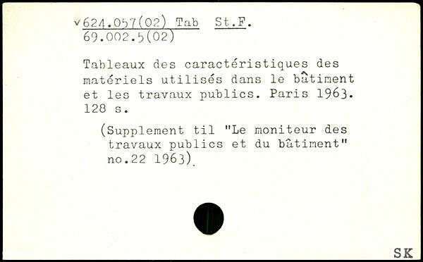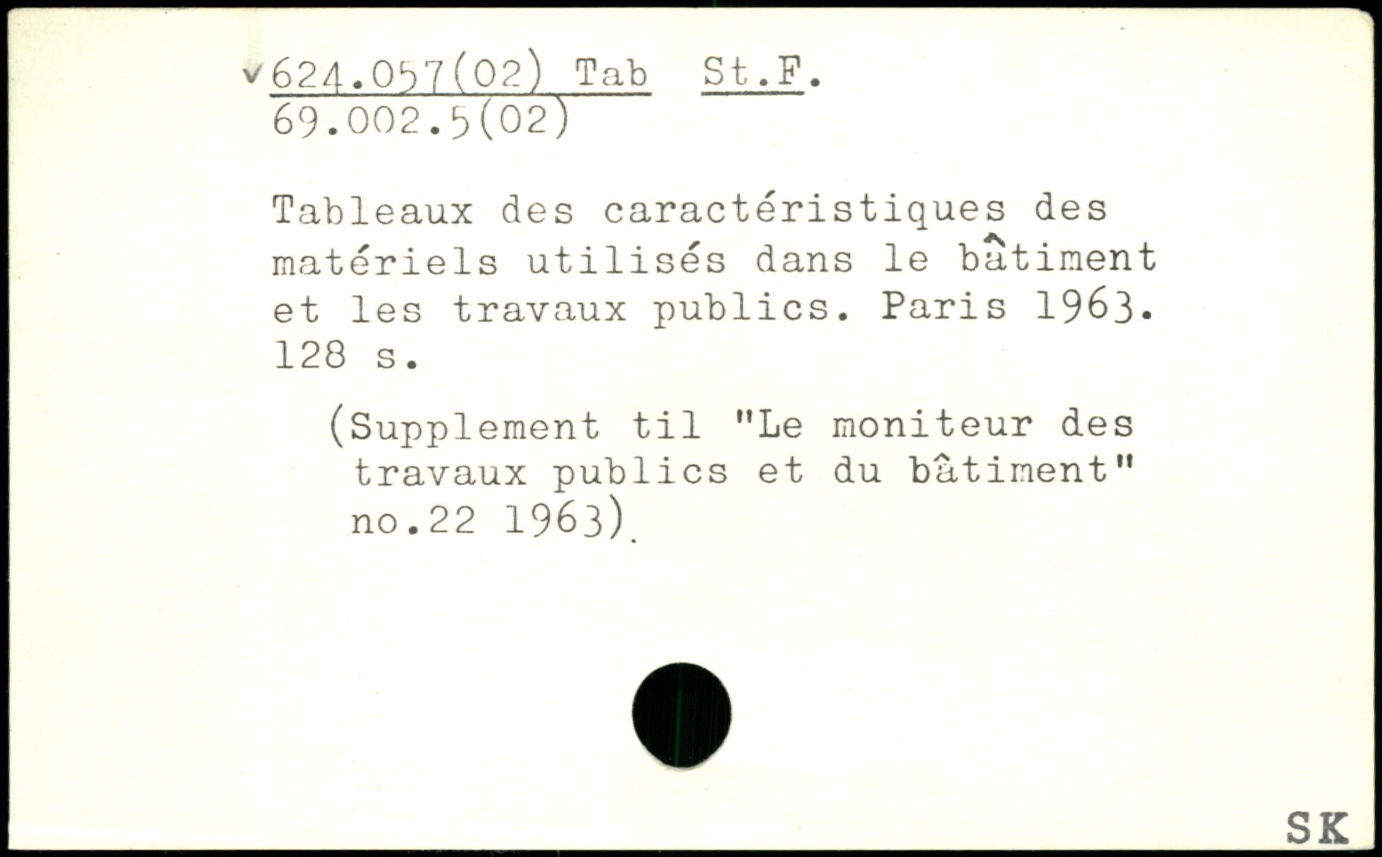 Tableaux des caractéristiques des matériels utilisés dans le batiment et les travaux publics.