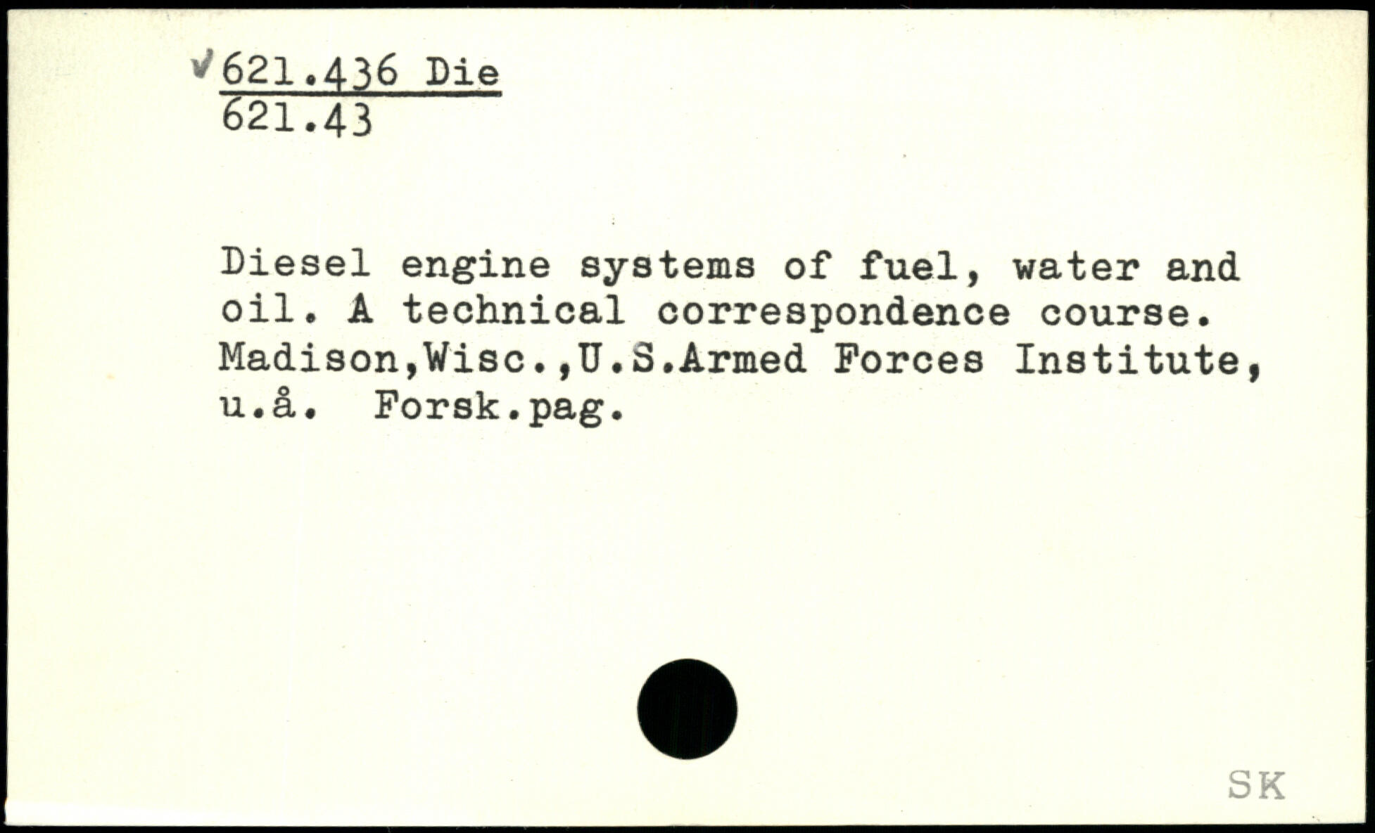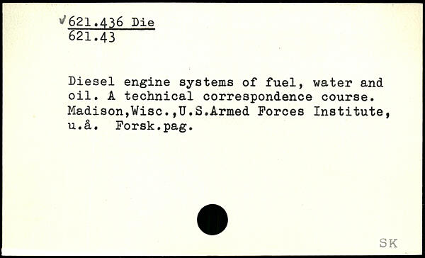 Diesel engine systems of fuel, water and oil. A technical correspondence course. Madison,Vise.,U.3.Armed Forces Institute, u.a. Forsk.pag.
