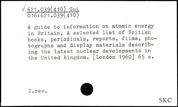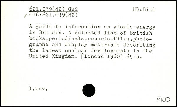 A guide to information on atomic energy in Britain, A selected list of British hooks, periodicals, reports, films, photographs and display materials describing the latest nuclear developments in the United Kingdom.
