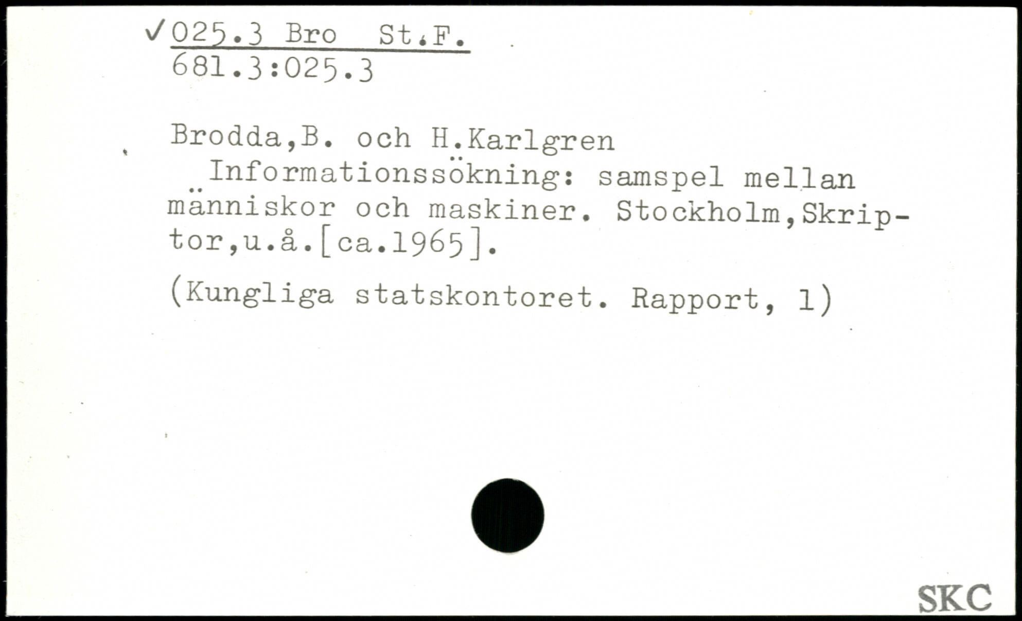 Informationssökning: samspel mellan människor och maskiner. Stockholm,Skrip-tor,u.å.[ca.1965]. (Kungliga statskontoret. Rapport, l) _________