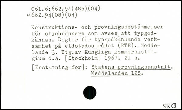 Konstruktions- och provningsfcestämmelser för oljebrannare som avses att typgodkännas. Regler för typgodkännande verksamhet på eldstadsområdet (RTE). Meddelande 3. Utg.av Kungliga kommerskollegium o.a. [Stockholm] 19Ö7