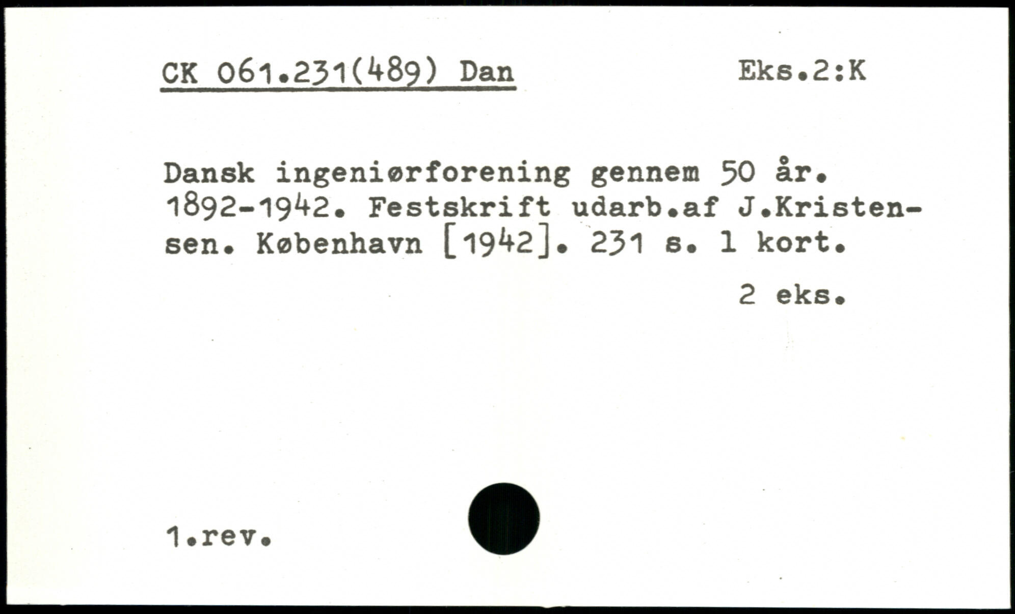 Dansk ingeniørforening gennem 50 år. 1892-19^2. Festskrift udarb.af J.Kristen-sen. København [19^2]. 231 6. 1 kort.