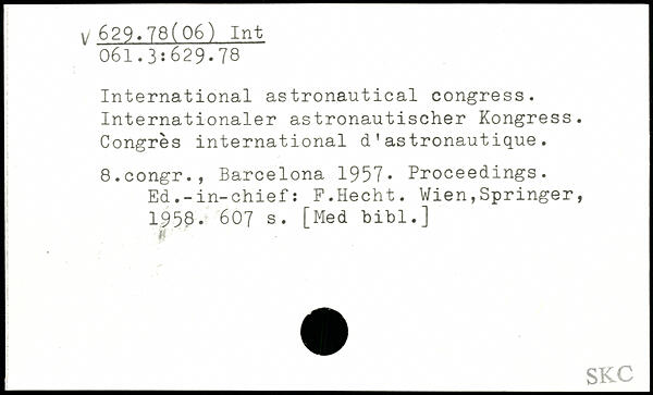 International astronautical congress. Internationaler astronautischer Kongress. Congrès international d’astronautique. 8.congr., Barcelona 1957. Proceedings. Ed.-in-chief: F.Hecht.