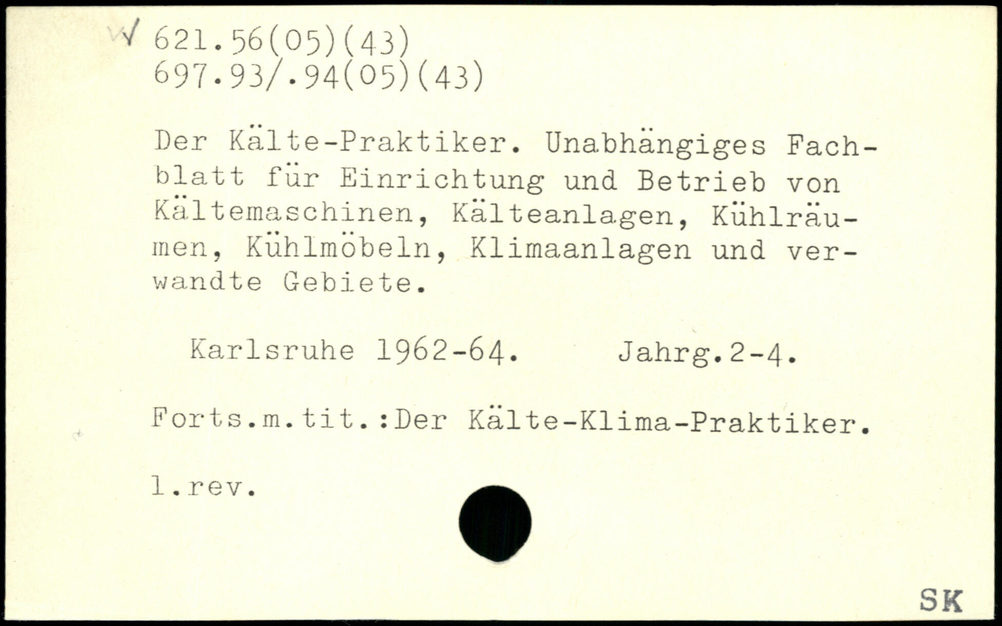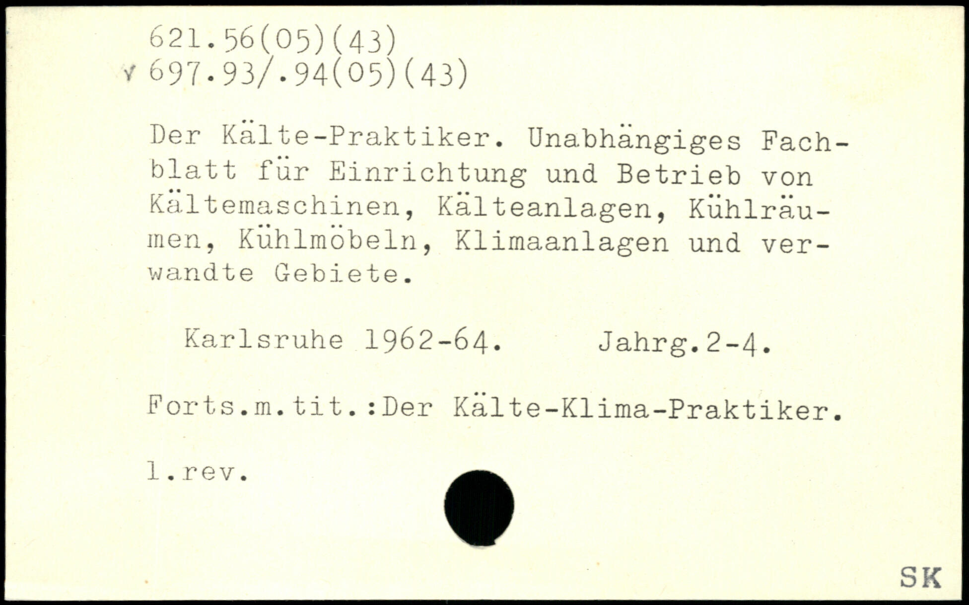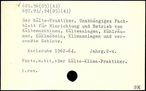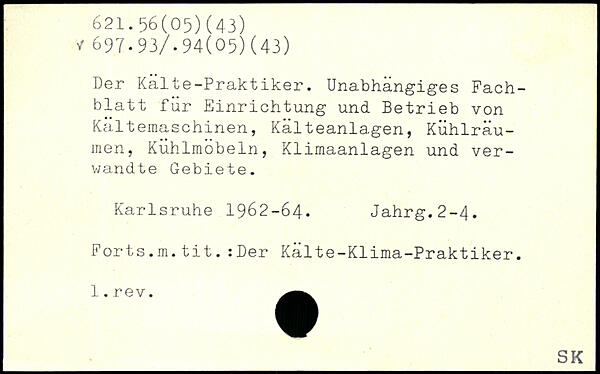 Der Kälte-Praktiker. Unabhängiges Fachblatt für Einrichtung und Betrieb von Kältemaschinen, Kälteanlagen, Kühlräu-men, Kühlmöbeln, Klimaanlagen und verwandte Gebiete. Karlsruhe 1962-64. Jahrg.2-4. Forts.m.tit.:Der Kälte-Klima-Praktiker.
