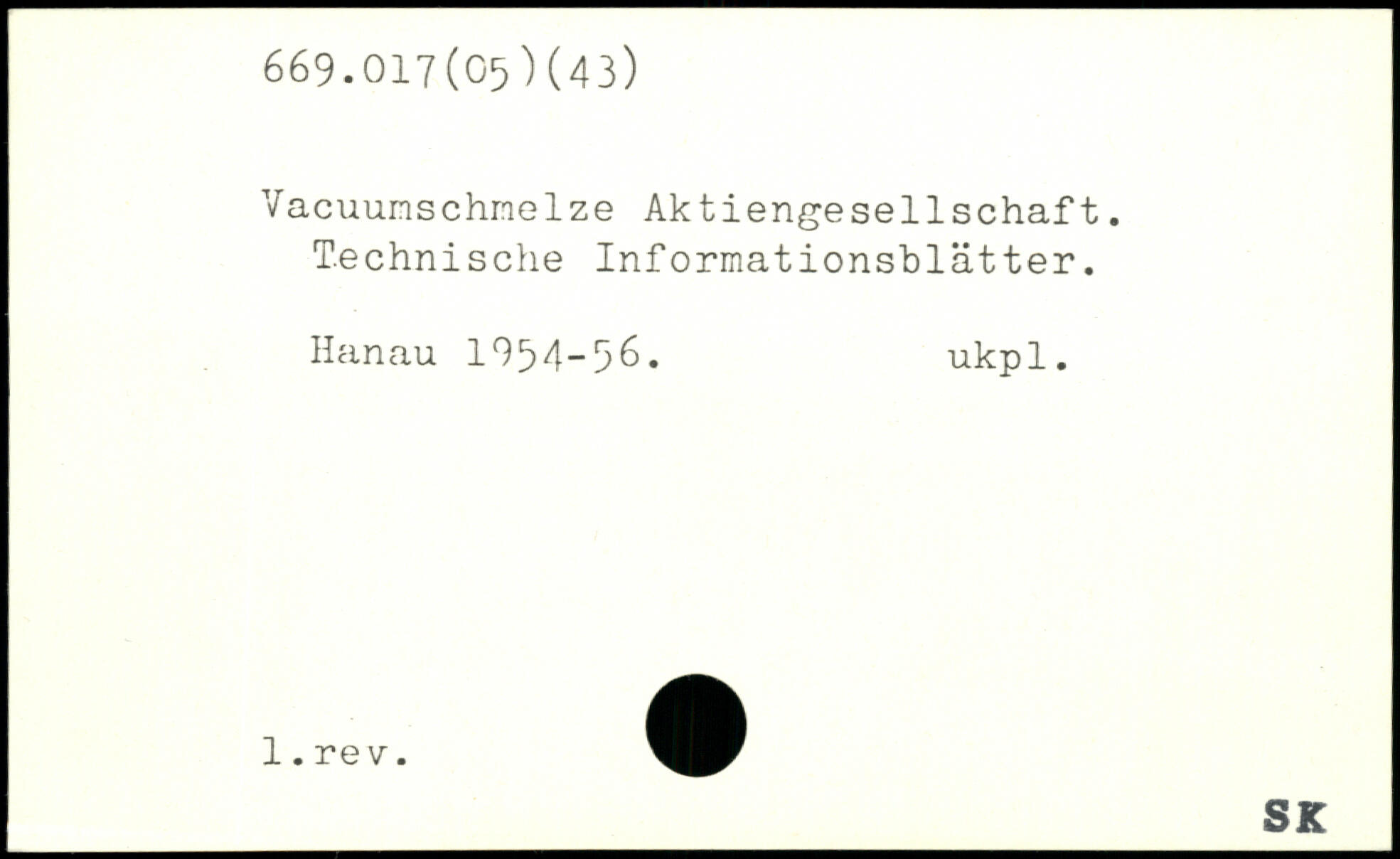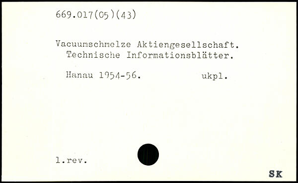 Vacuunschmelze Aktiengesellschaft. Technische Informationsblätter. Hanau 1954-5^. ukpl.