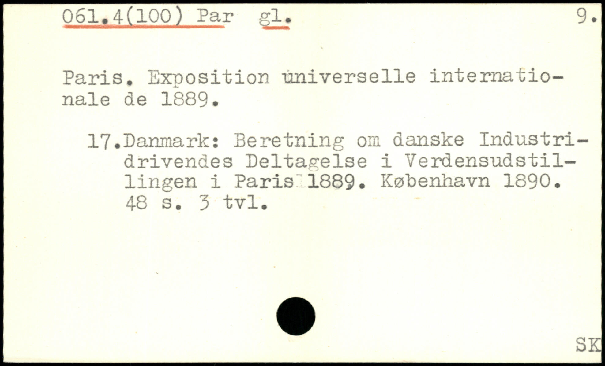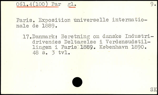 Paris. Exposition universelle internationale de 1889. 17.Danmark: Beretning om danske Industridrivendes Deltagelse i Verdensudst1111ngen i Paris" 1889.