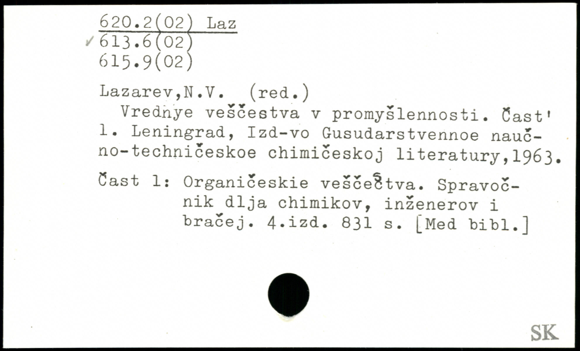 Vrednye vescestva v promyslennosti. Cast' 1. Leningrad, Izd-vo Gusudarstvennoe nauc-no-techniceskoe chimiceskoj literatury,1963. Cast 1: Organiceskie vesceBtva. Spravoc- nik dlja chimikov, inzenerov i j bracej. 4.izd.