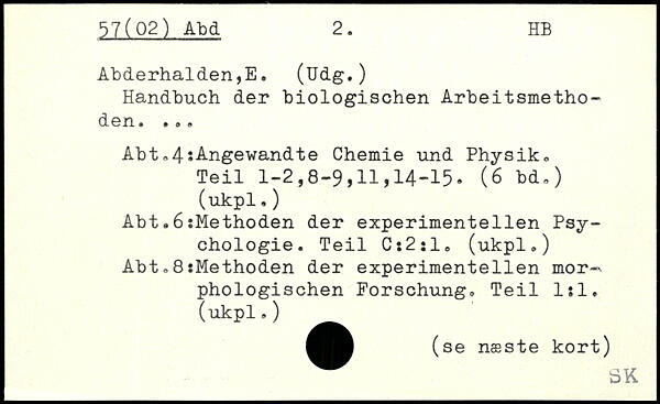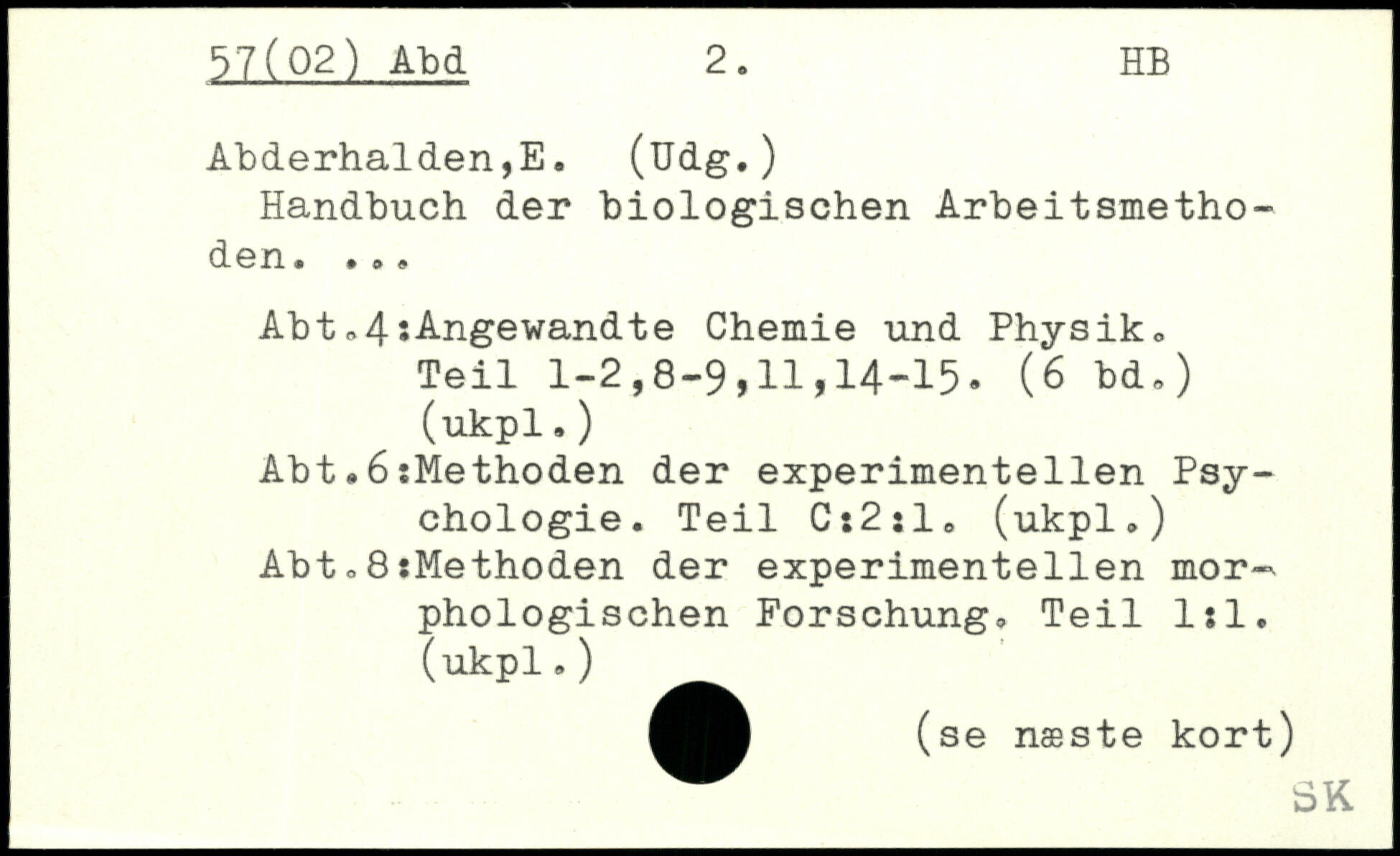 Abderhalden,E. (üdg.) Handbuch der biologischen Arbeitsmethoden. .,. Abt.4iAngewandte Chemie und Physik. Teil 1-2,8-9,11,14-15. (6 bd.) (ukpl.) Abt.6:Methoden der experimentellen Psychologie. Teil C:2:lo (ukpl.) Abt.8sMethoden der experimentellen mor-' phologischen Forschung. Teil 1:1. (ukpl.)