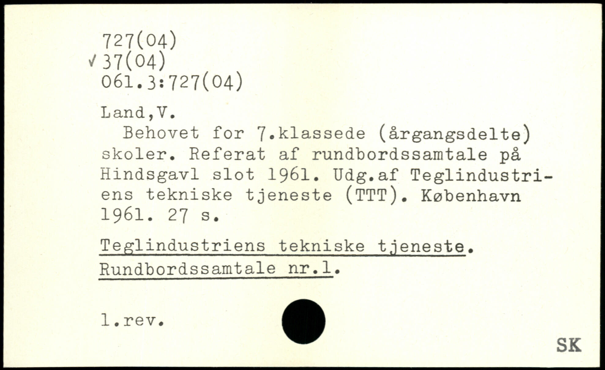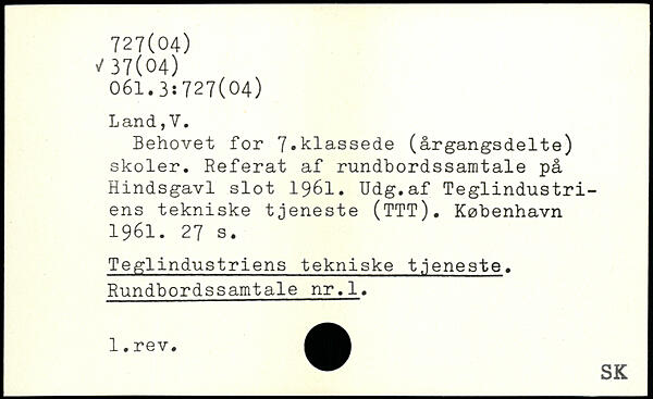 Behovet for 7.klassede (årgangsdelte) skoler. Referat af rundbordssamtale på Hindsgavl slot 1961. Udg.af Teglindustriens tekniske tjeneste (TTT).