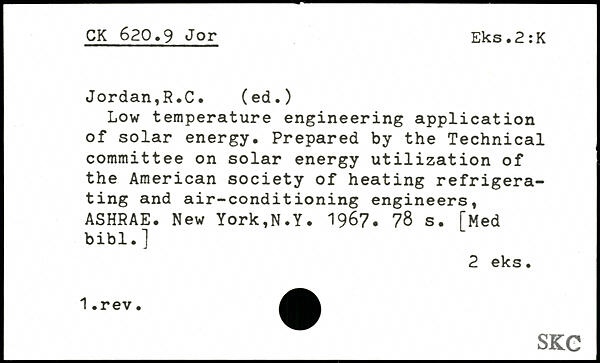 Low temperature engineering application of solar energy. Prepared by the Technical committee on solar energy utilization of the American society of heating refrigerating and air-conditioning engineers, ASHRAE. New York,N.Y. 1967.