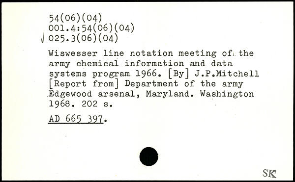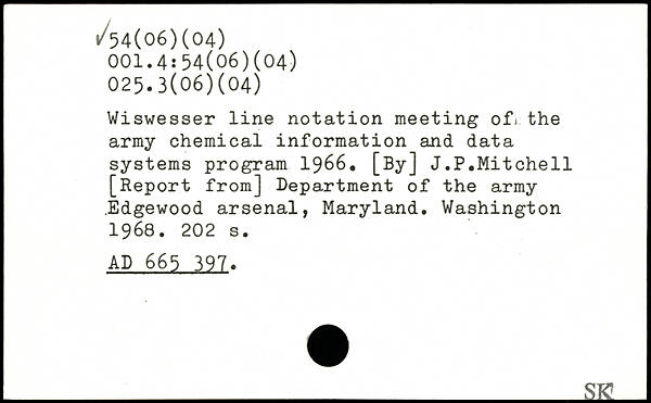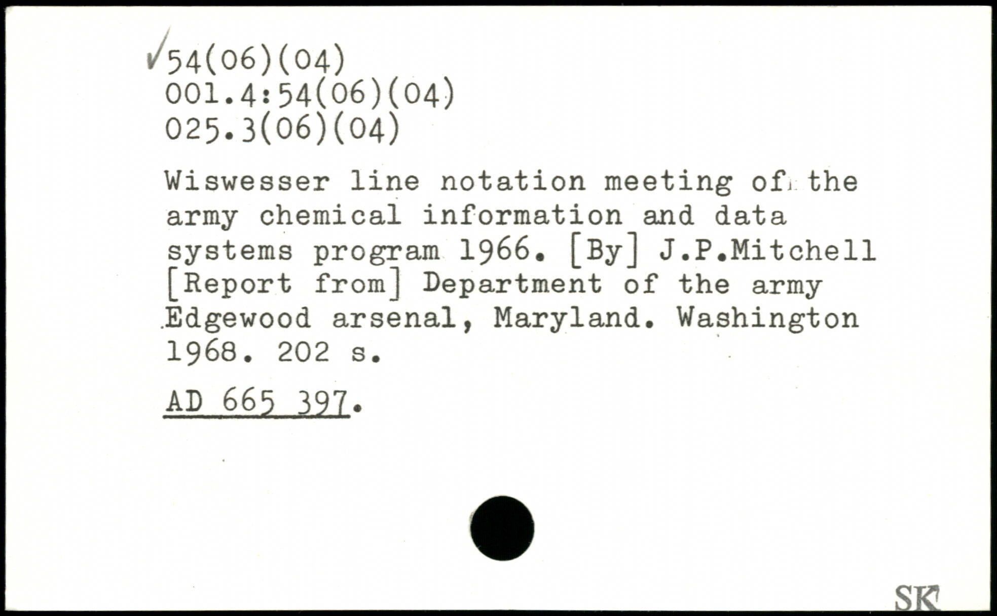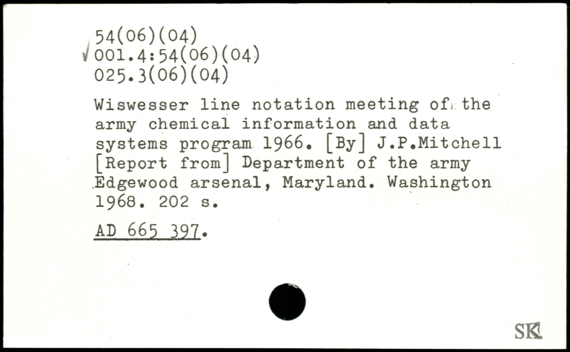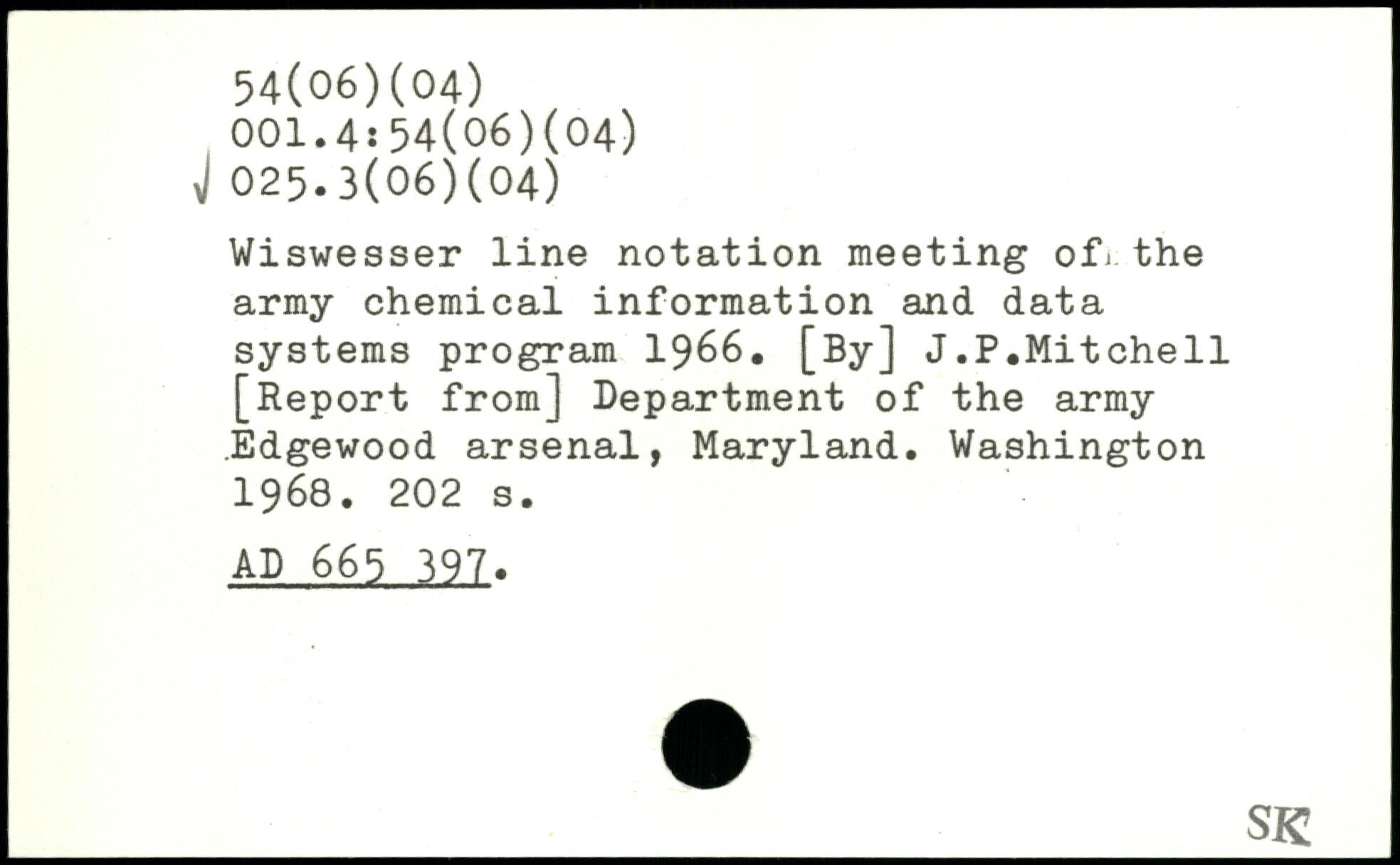 Wiswesser line notation meeting of. the army chemical information and data systems program 1966. [By] J.P.Mitchell [Report from] Department of the army Edgewood arsenal, Maryland.