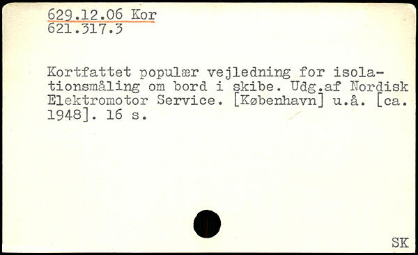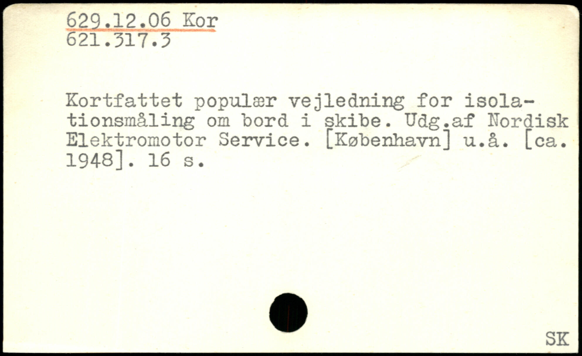 Kortfattet populær vejledning for isola-tionsmåling om ’oord i skibe. Udg.af Nordisk Elektromotor Service. [København] u.å. [ca. 1948].