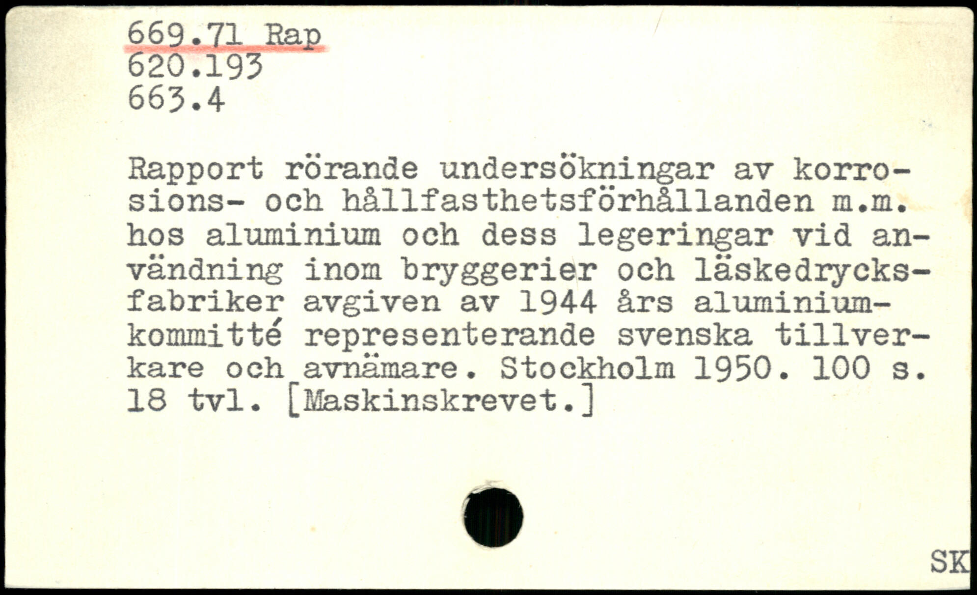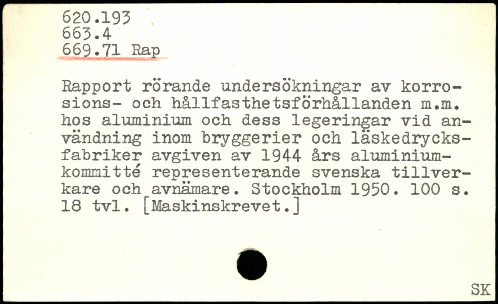Rapport rörande undersökningar av korrosions- och hållfasthetsförhållanden m.m. hos aluminium och dess legeringar vid användning inom bryggerier och läskedrycks-fabriker avgiven av 1944 års aluminiumkommitté representerande svenska tillverkare och avnämare.