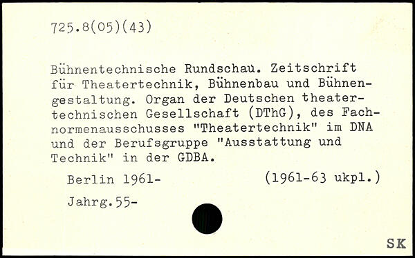 Buhnentechnische Rundschau. Zeitschrift für Theatertechnik, Bühnenbau und Bühnengestaltung. Organ der Deutschen theater-technischen Gesellschaft (DThG), des Fachnormenausschusses "Theatertechnik" im DNA und der Berufsgruppe "Ausstattung und Technik" in der GDBA.