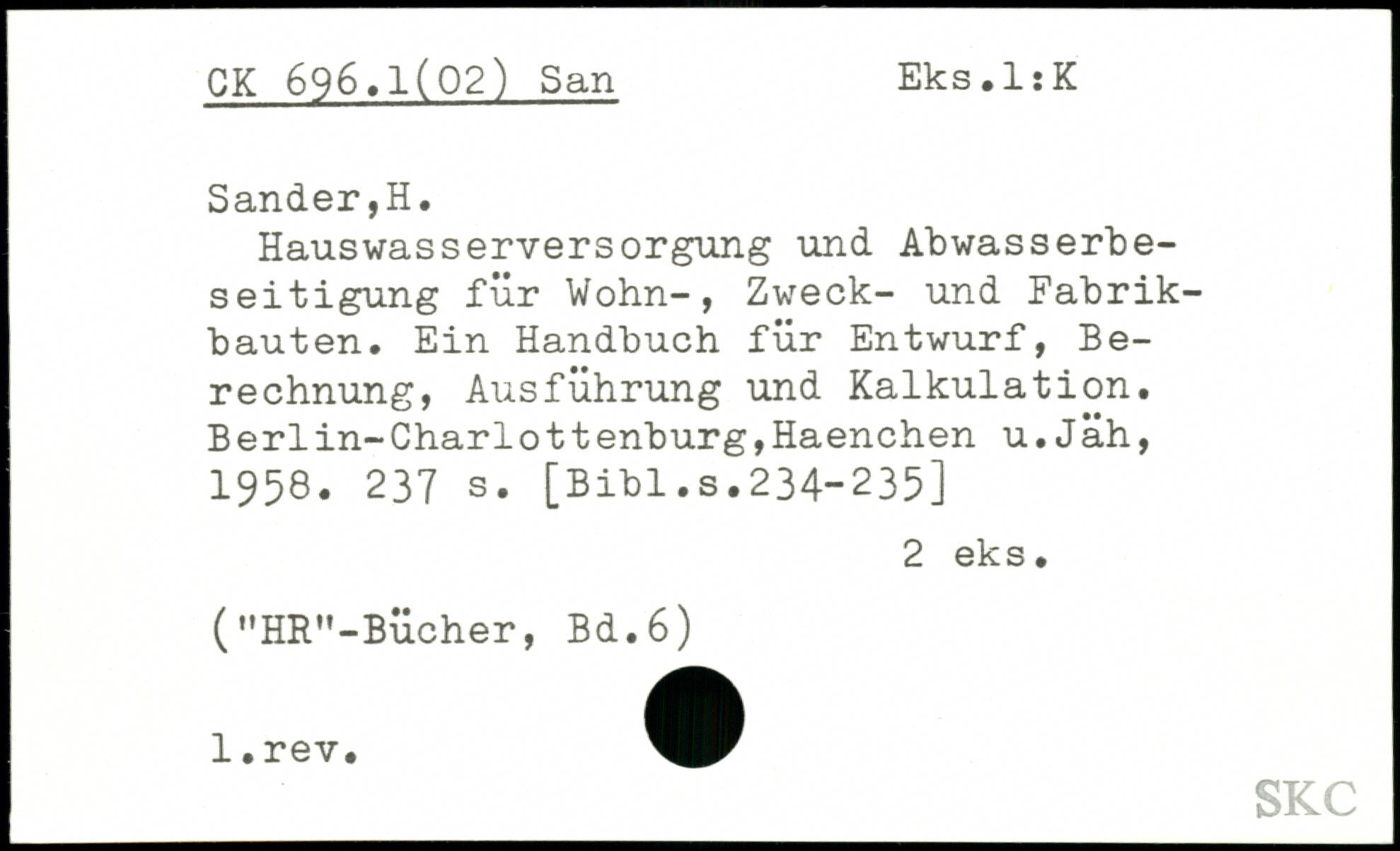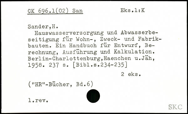 Hauswasserversorgung und Abwasserbe-seitigung für Wohn-, Zweck- und Fabrikbauten. Ein Handbuch für Entwurf, Berechnung, Ausführung und Kalkulation. Berlin~Charlottenburg,Haenchen u.Jäh, 1958.