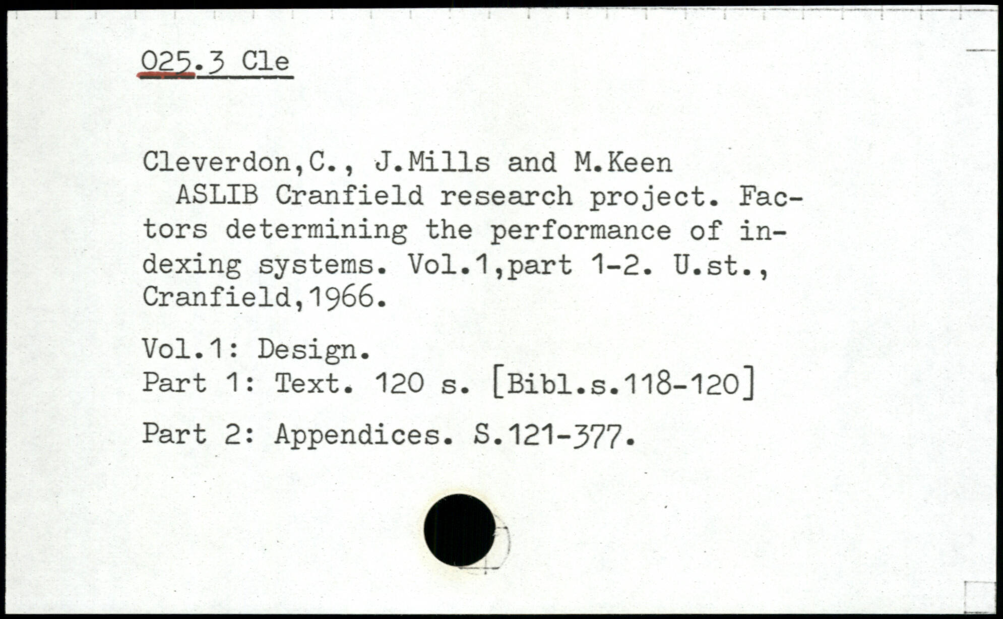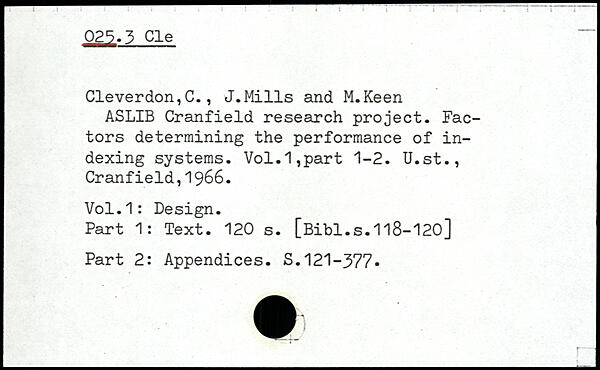 ASLIB Cranfield research project. Factors determining the performance of indexing systems.