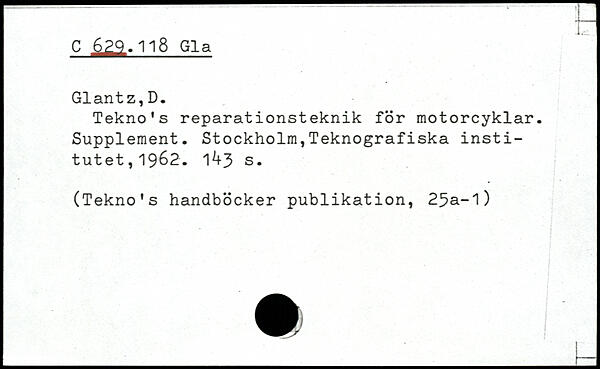 tr C $^.118 Gla Glantz,D. Tekno's reparationsteknik för motorcyklar. Supplement. Stockholm,Teknografiska institutet, 19é2. 1^