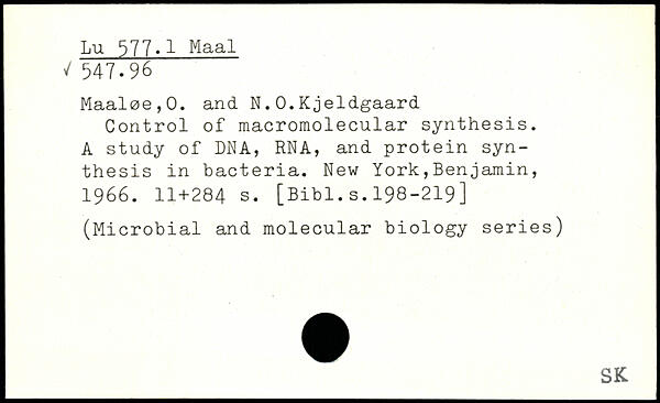 Maal0e,O. and. N. 0. K jeldgaard Control of macromolecular synthesis. A study of DNA, RNA, and protein synthesis in bacteria.