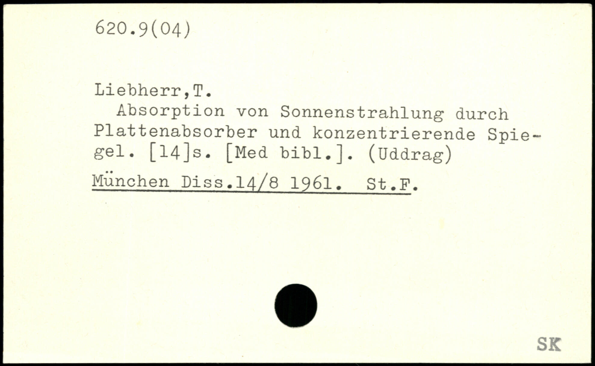 Absorption von Sonnenstrahlung durch Plattenabsorber und konzentrierende Spiegel. [I4]s. [Med bibl.]. (üddrag) München Diss.14/8 1961. St.F.