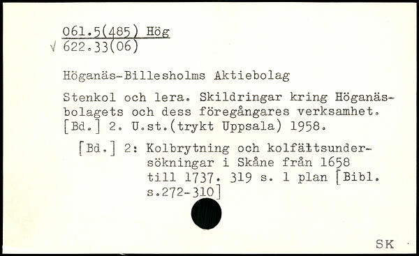 Höganäs-Billesholms Aktiebolag Stenkol och lera. Skildringar kring Höganäs-bolagets och dess föregångares verksamhet. [Bd.] 2. U.st.(trykt Uppsala) 1958. [Bd.] 2: Kolbrytning och kolfältsunder-sökningar i Skåne från 1658 till 1737.